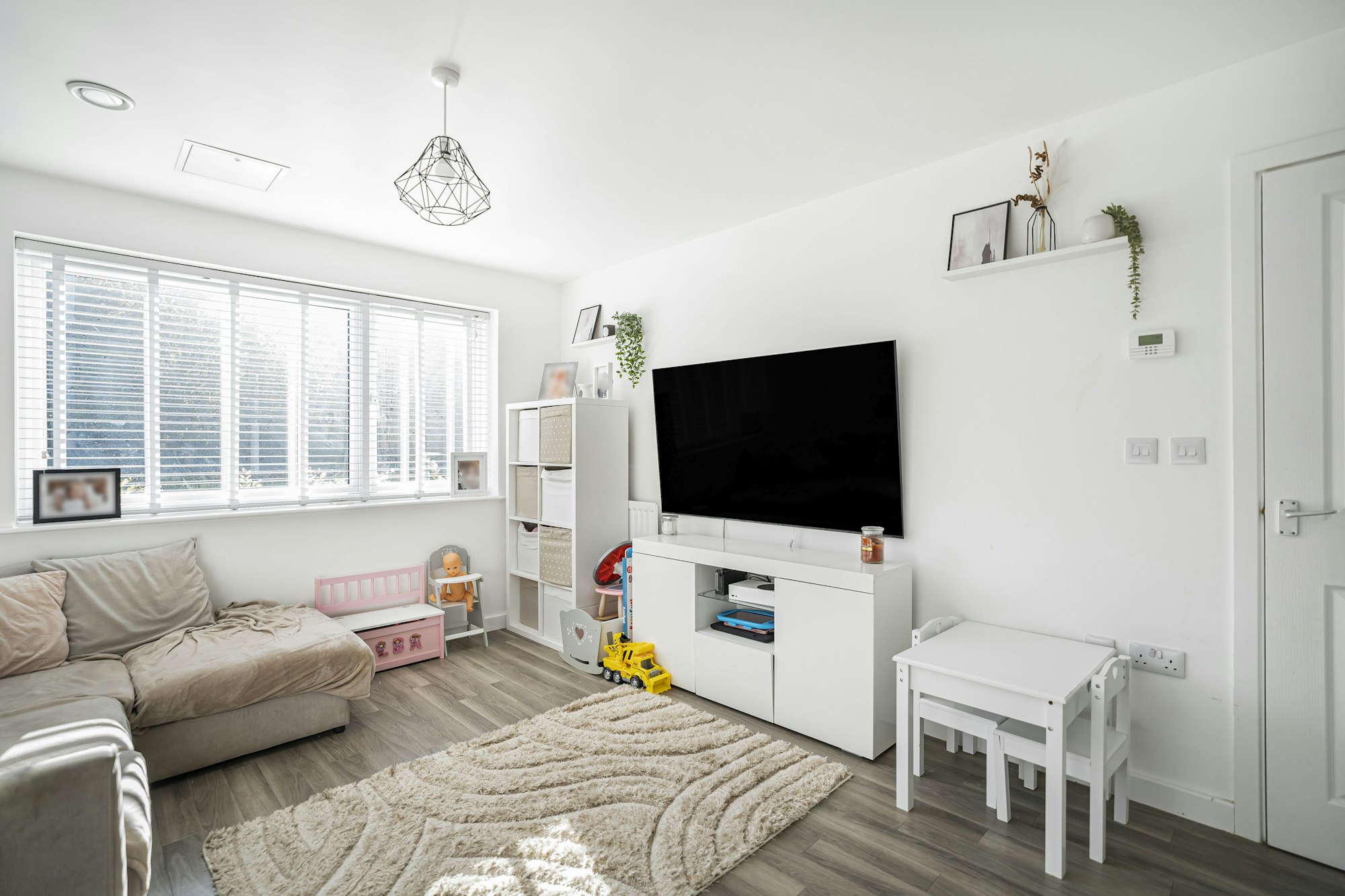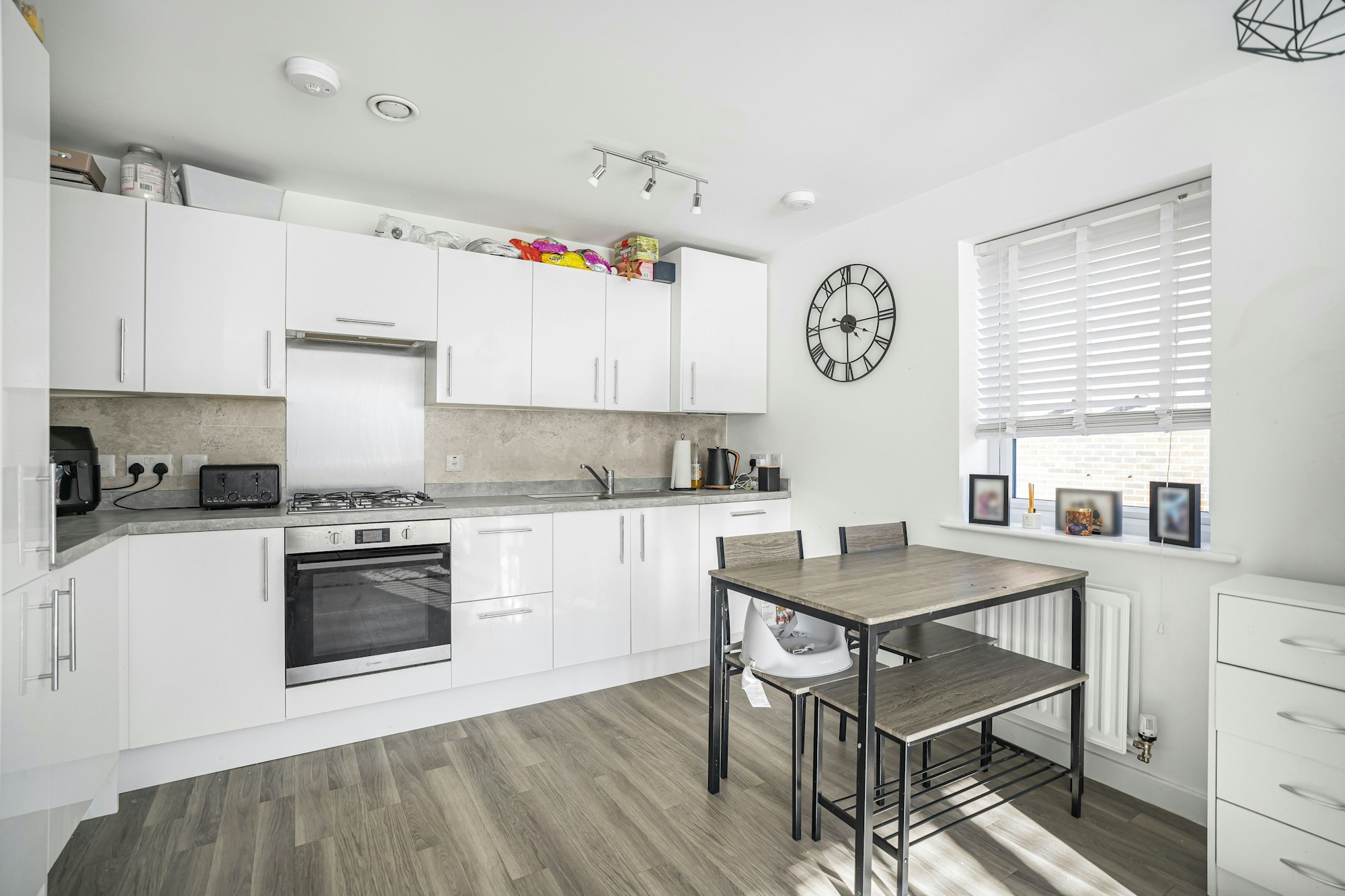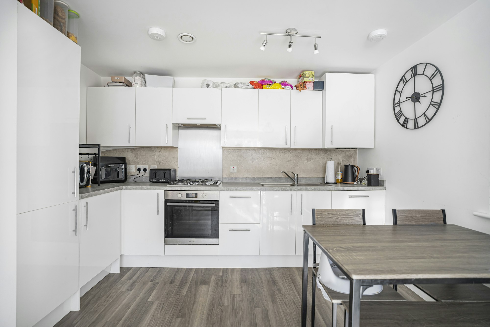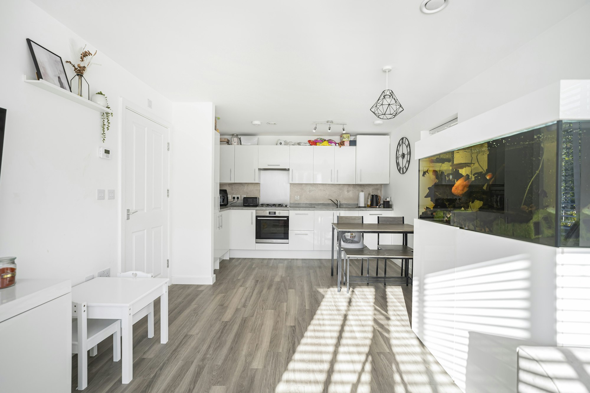 At the heart of the home is a bright and airy open-plan kitchen and living space, enhanced by double-aspect windows that flood the room with natural light. The kitchen is well-appointed with integrated appliances and ample storage, ideal for modern day living.