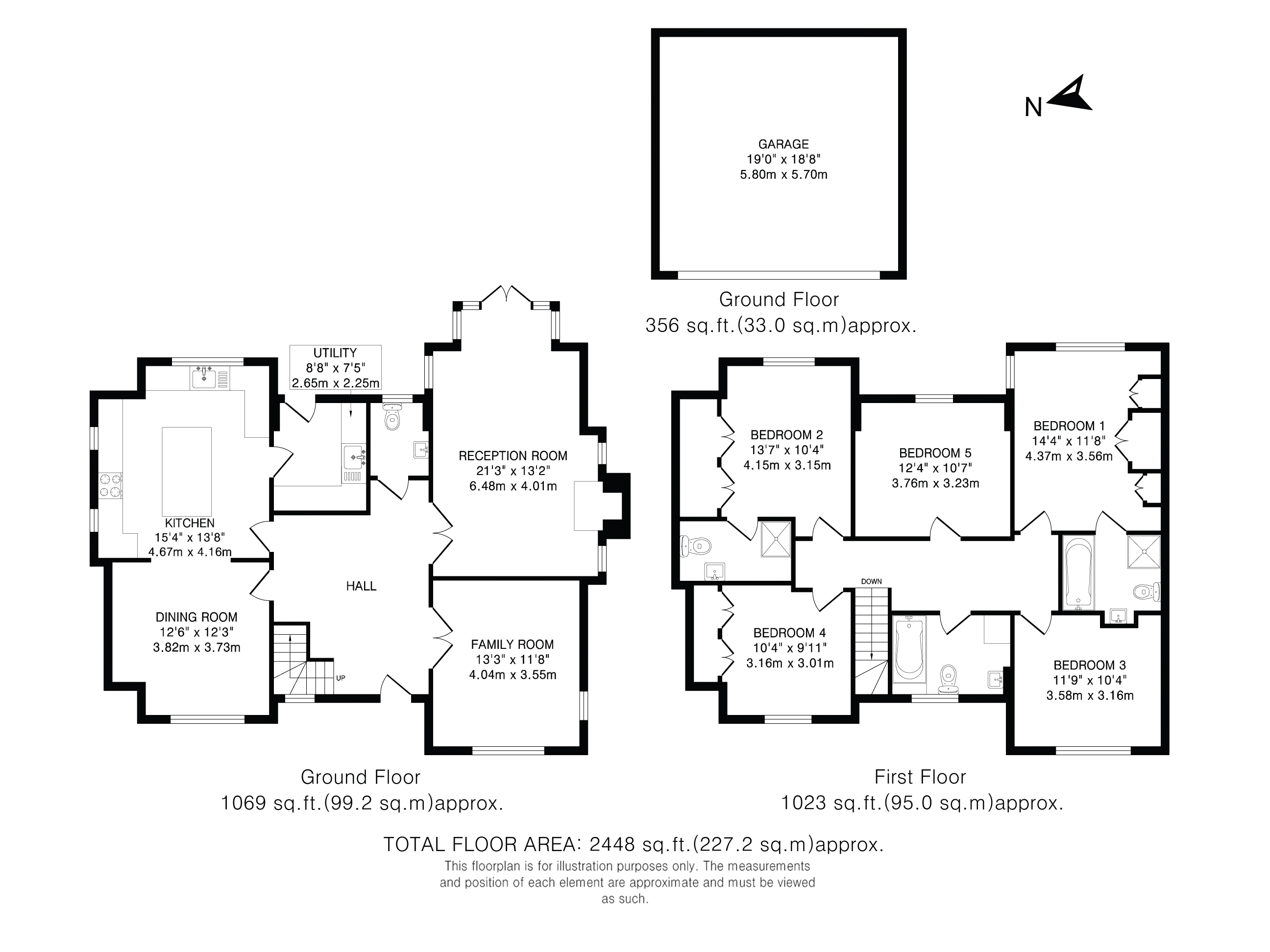 Upstairs, the principal bedroom features fitted wardrobes and a stylish en-suite bathroom. The guest double bedroom also includes fitted wardrobes and an en-suite shower room, while three additional bedrooms are served by a modern family bathroom.