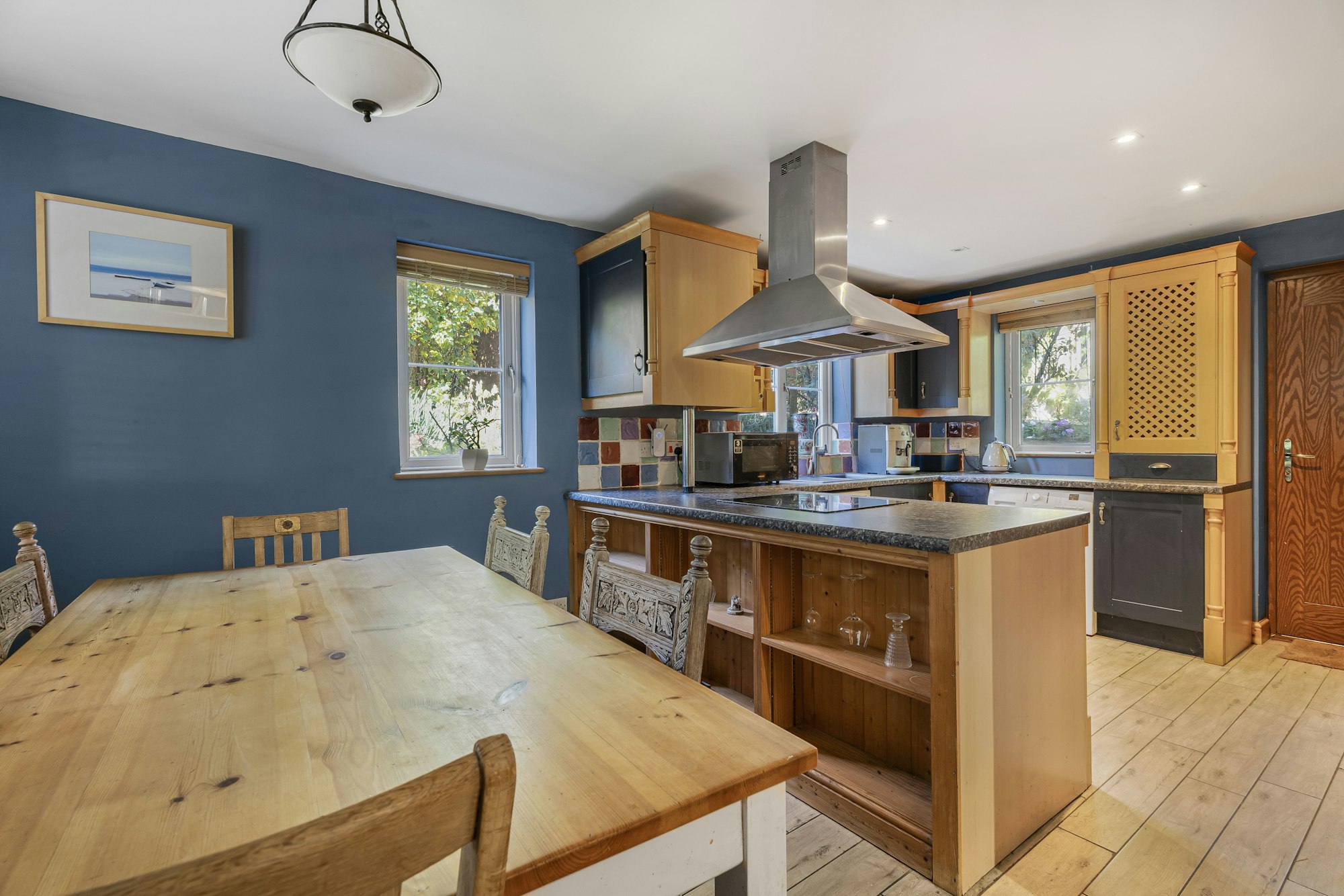 To the rear of the hall, the home opens into a superb L-shaped kitchen/breakfast room, cleverly designed for modern living and effortlessly connecting a useful lobby or office area with the dining space and the kitchen beyond. With four large windows across three exterior walls, this entire open-plan area is bathed in natural light throughout the day. The dining area easily houses a full dining suite, while a central island with integrated hob and oven subtly defines the transition into the well-organised kitchen, which offers excellent storage, plentiful worktops, designated spaces for appliances, and a rear window framing views of the garden. A rear door provides direct access outdoors.