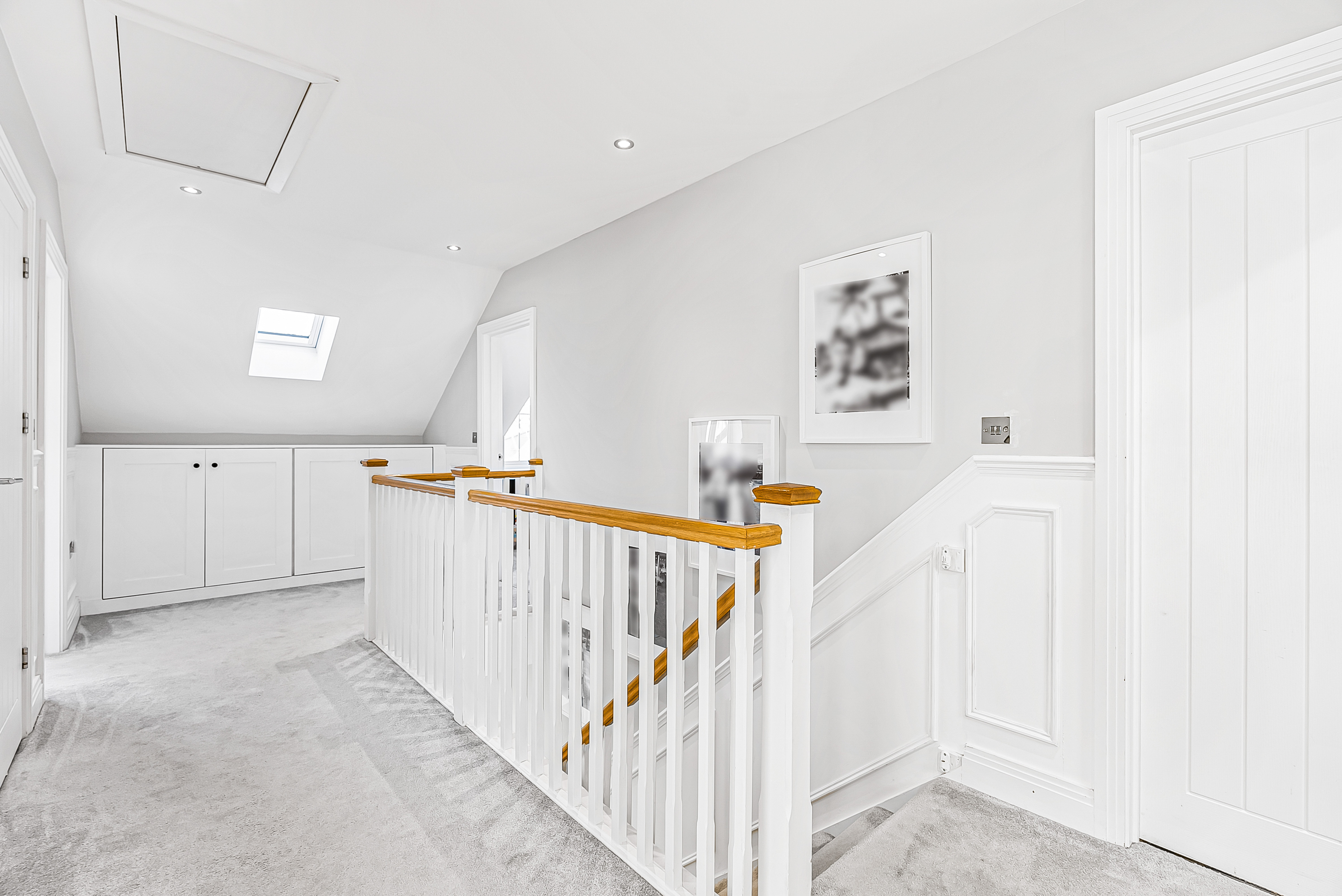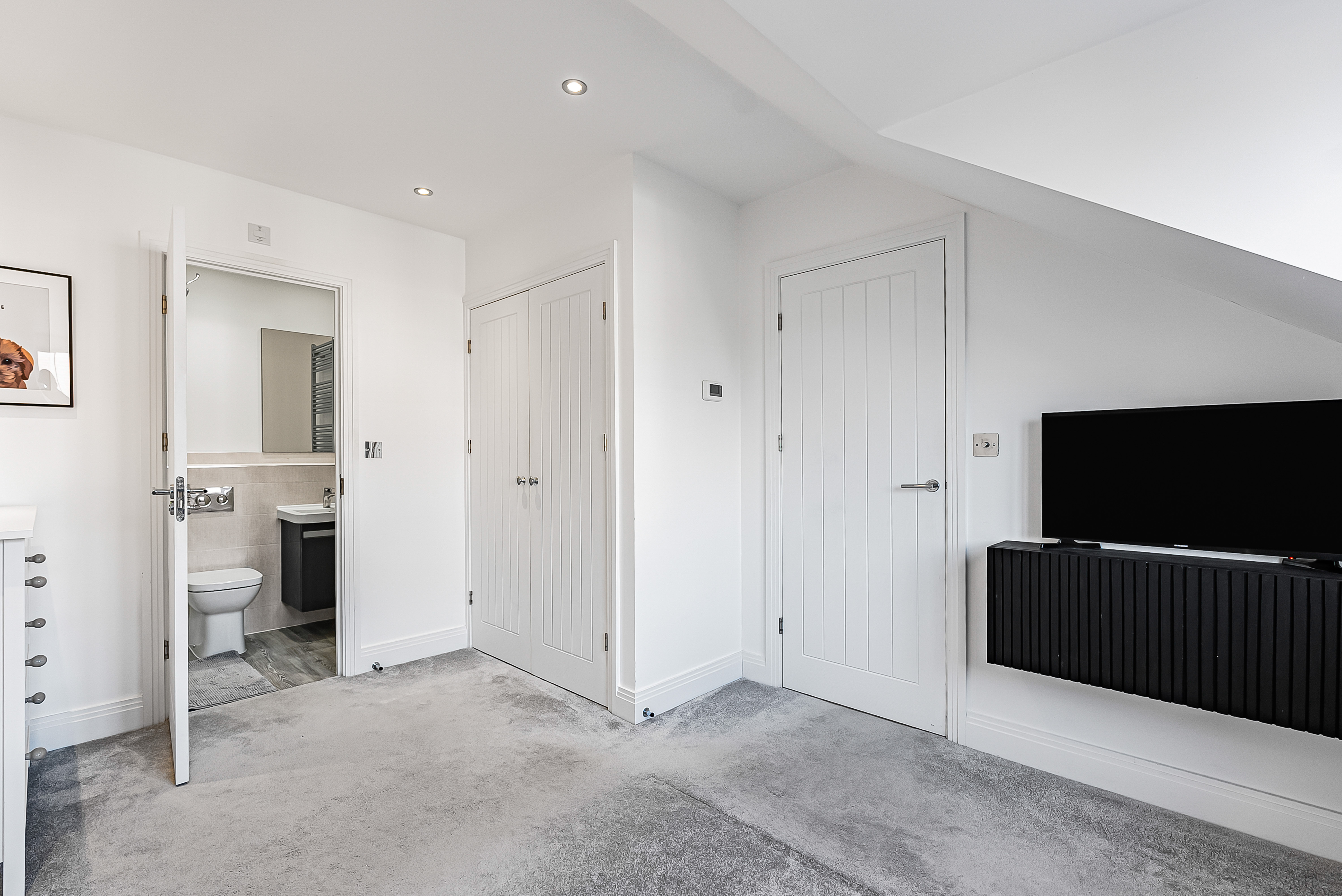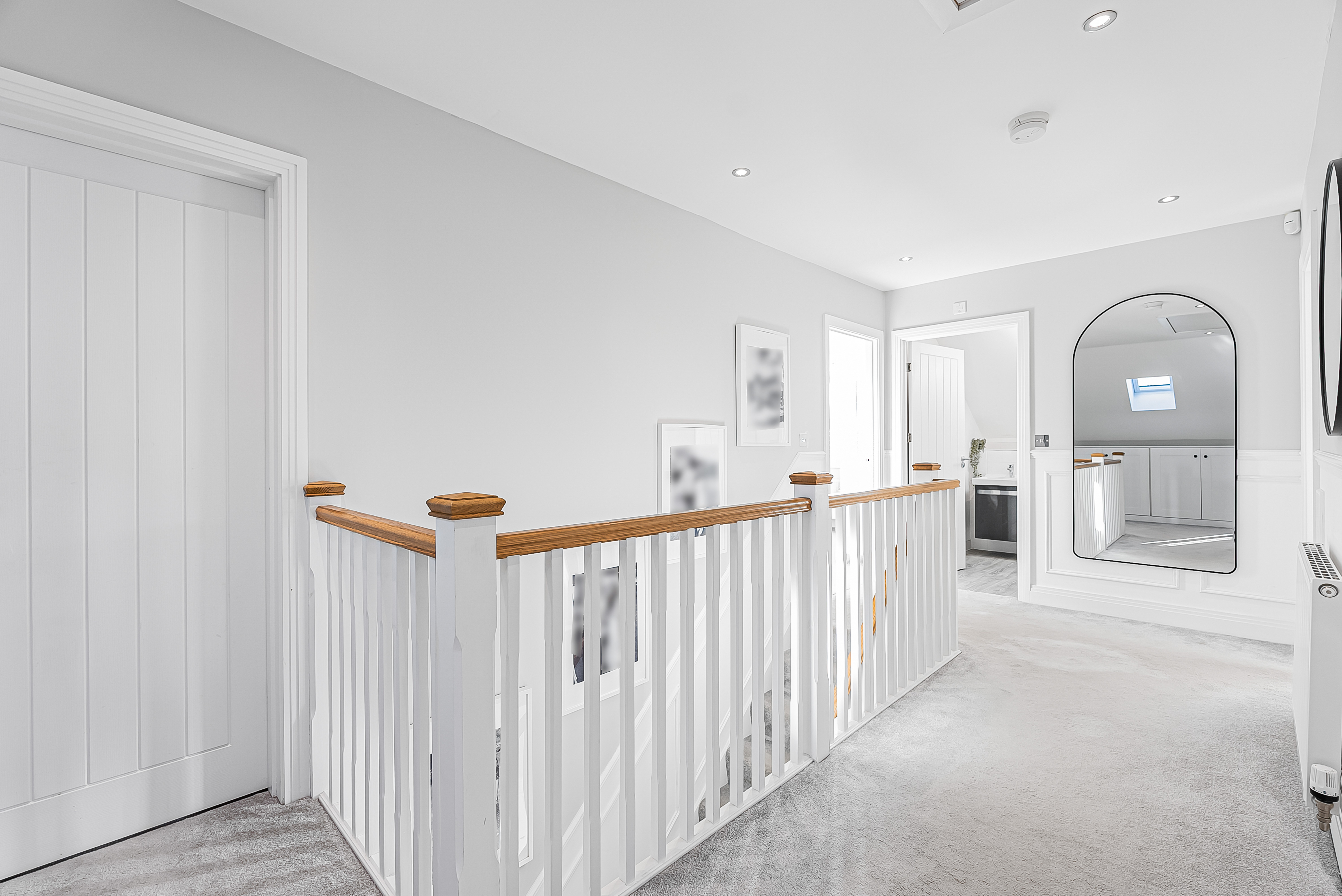 The first floor continues to impress, with a spacious landing illuminated by a Velux roof window, additional storage and access to a partly boarded loft. The principal bedroom enjoys elevated countryside views and benefits from a walk-in wardrobe and sleek en-suite shower room. A second double bedroom also boasts en-suite facilities, while two further generous double bedrooms are served by a modern family bathroom.