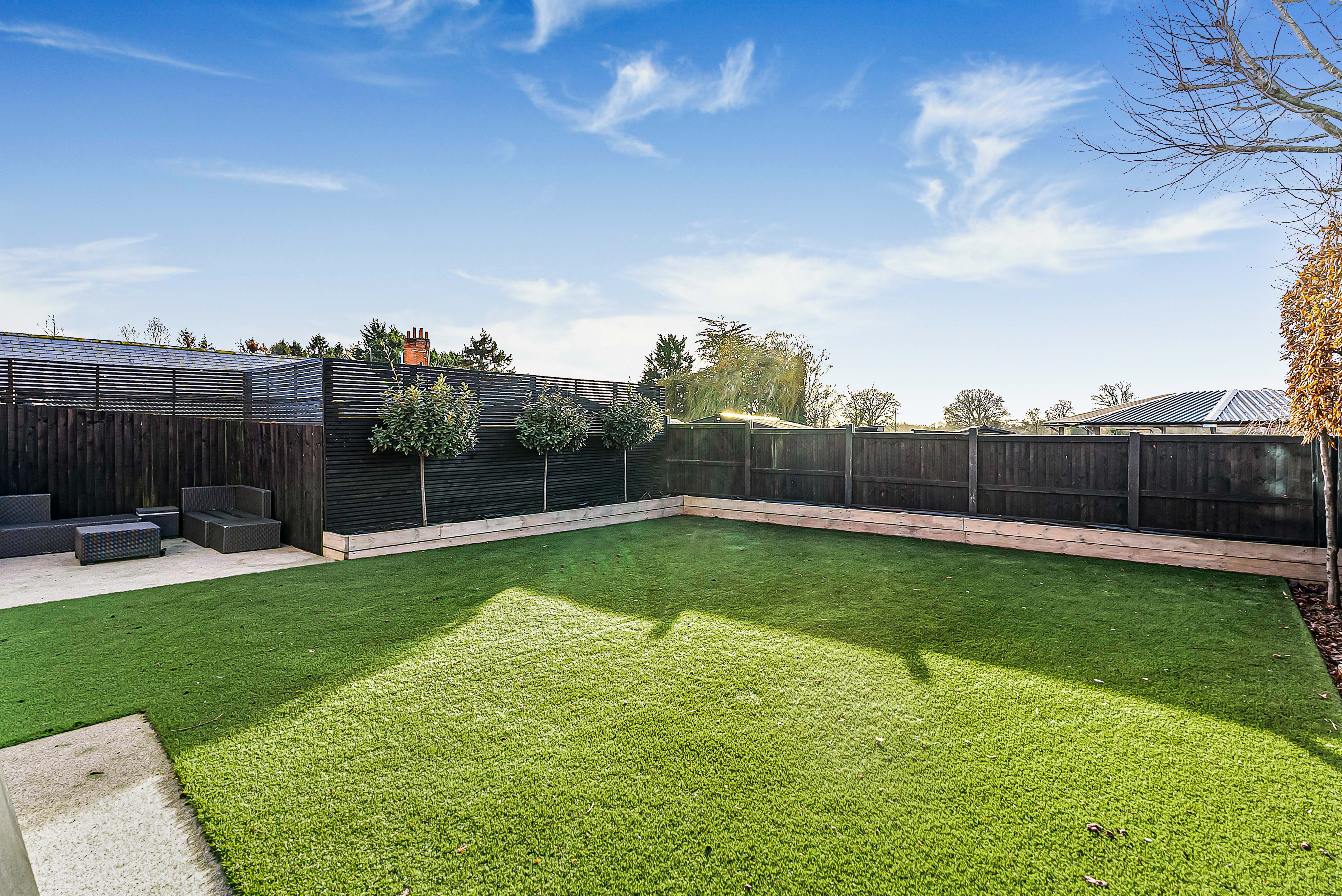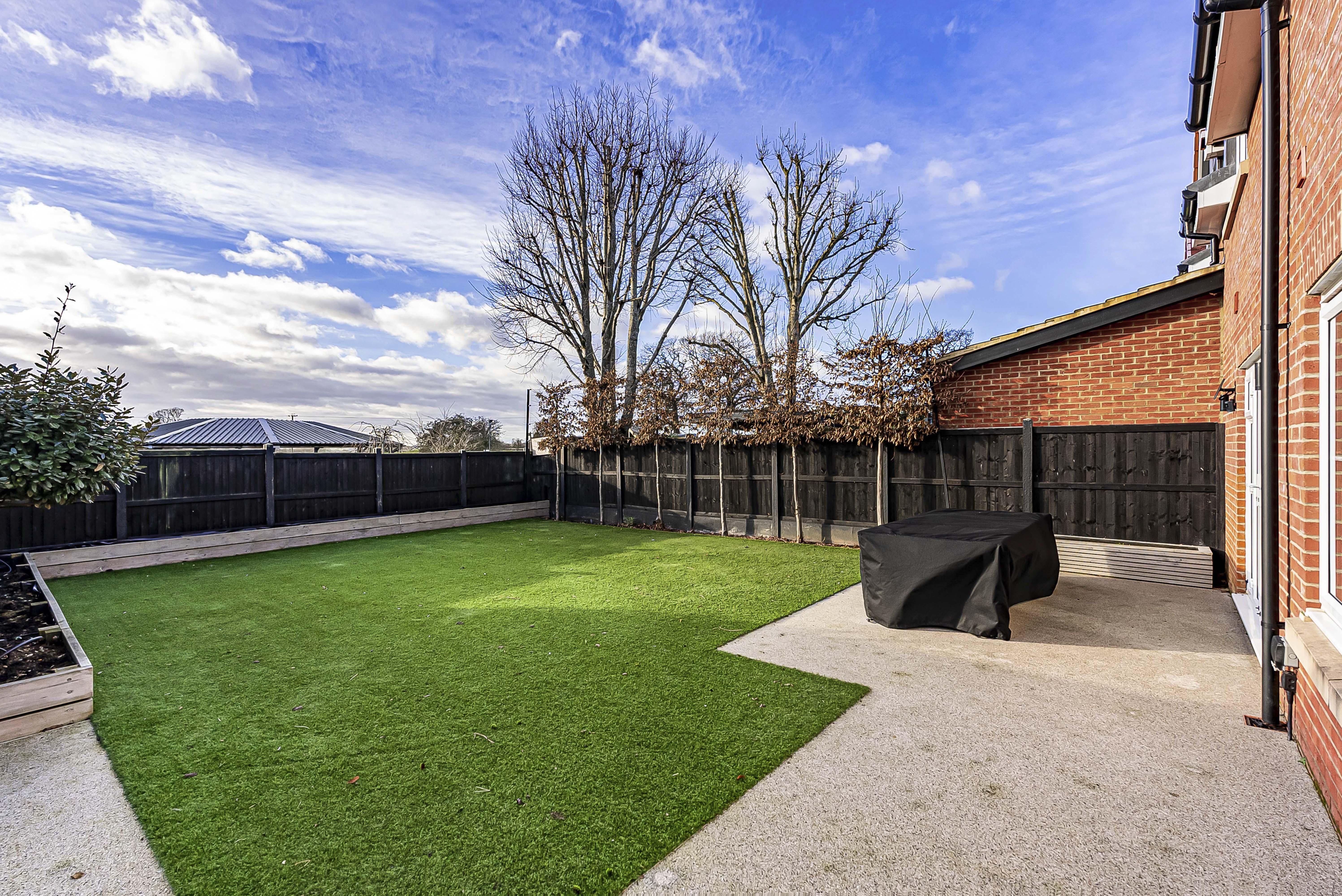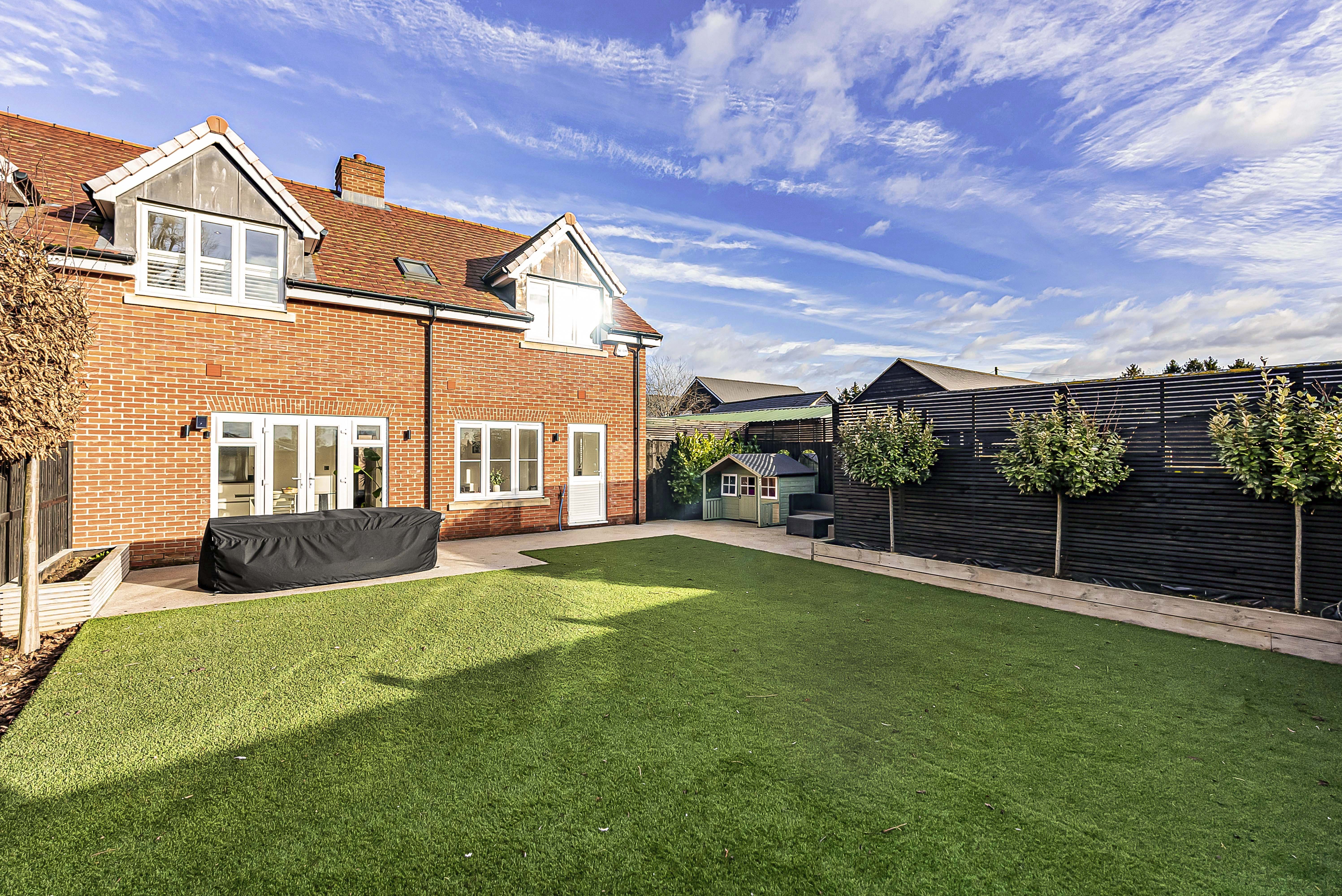 Outside, the landscaped rear garden has been designed for both ease of maintenance and enjoyment, featuring artificial lawn, ample patio space for entertaining, and raised beds with carefully chosen planting. Pleached trees provide privacy while enhancing the open, countryside feel. A wide side access leads to a storage shed and onto the front of the property, where a driveway offers ample parking. The garage is a particular highlight, large enough to accommodate a car and fitted with power, lighting, an up and over door to the front and internal access into the utility room.