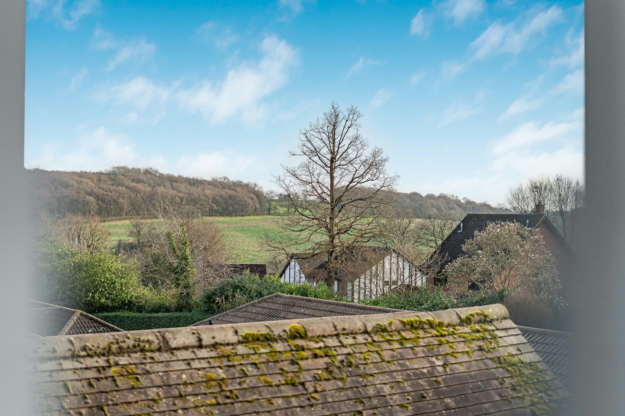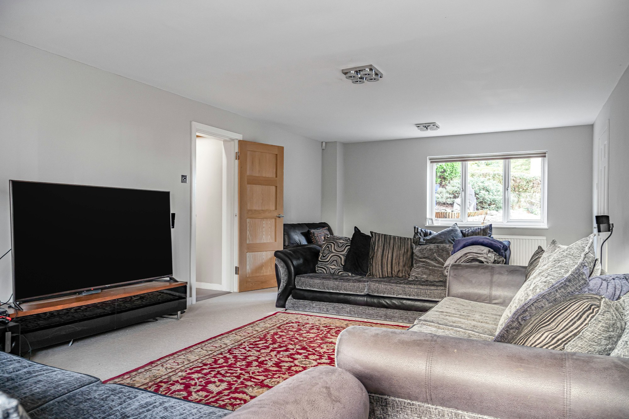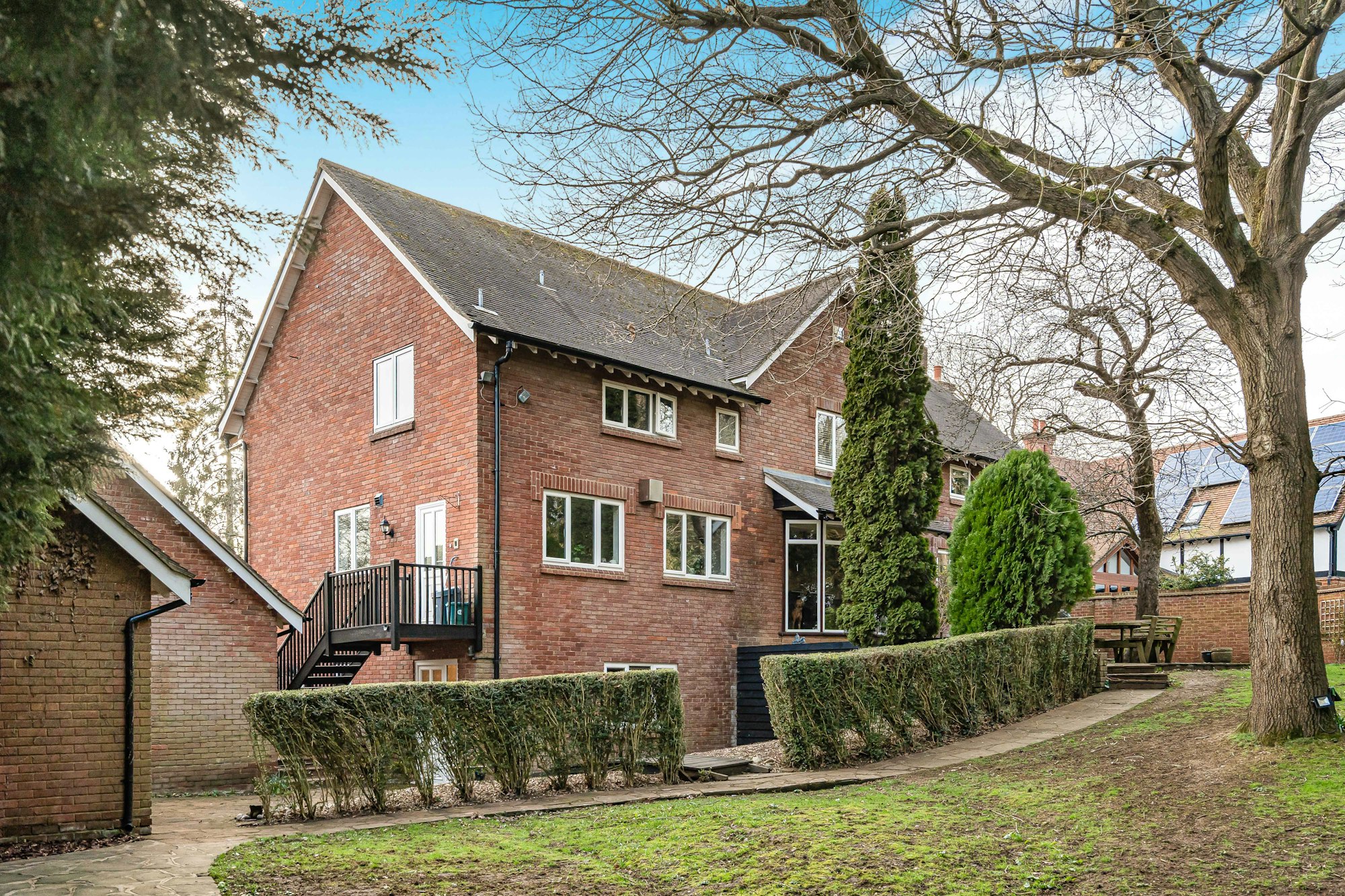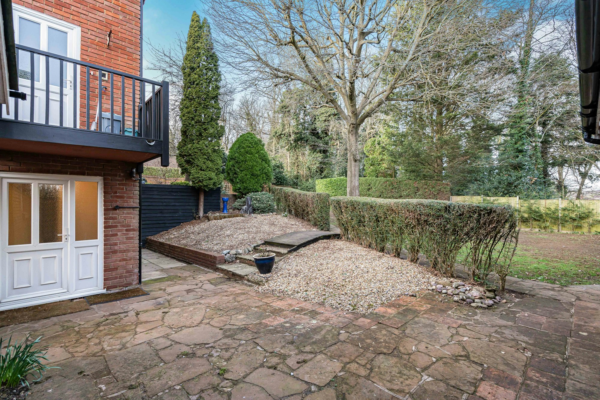 The rear garden, measuring approximately 0.4 acres, is enclosed by hedges and bordered by mature trees and shrubs. A patio area provides the perfect space for entertaining, while the expansive lawn offers a tranquil setting that adjoins protected private woodland.