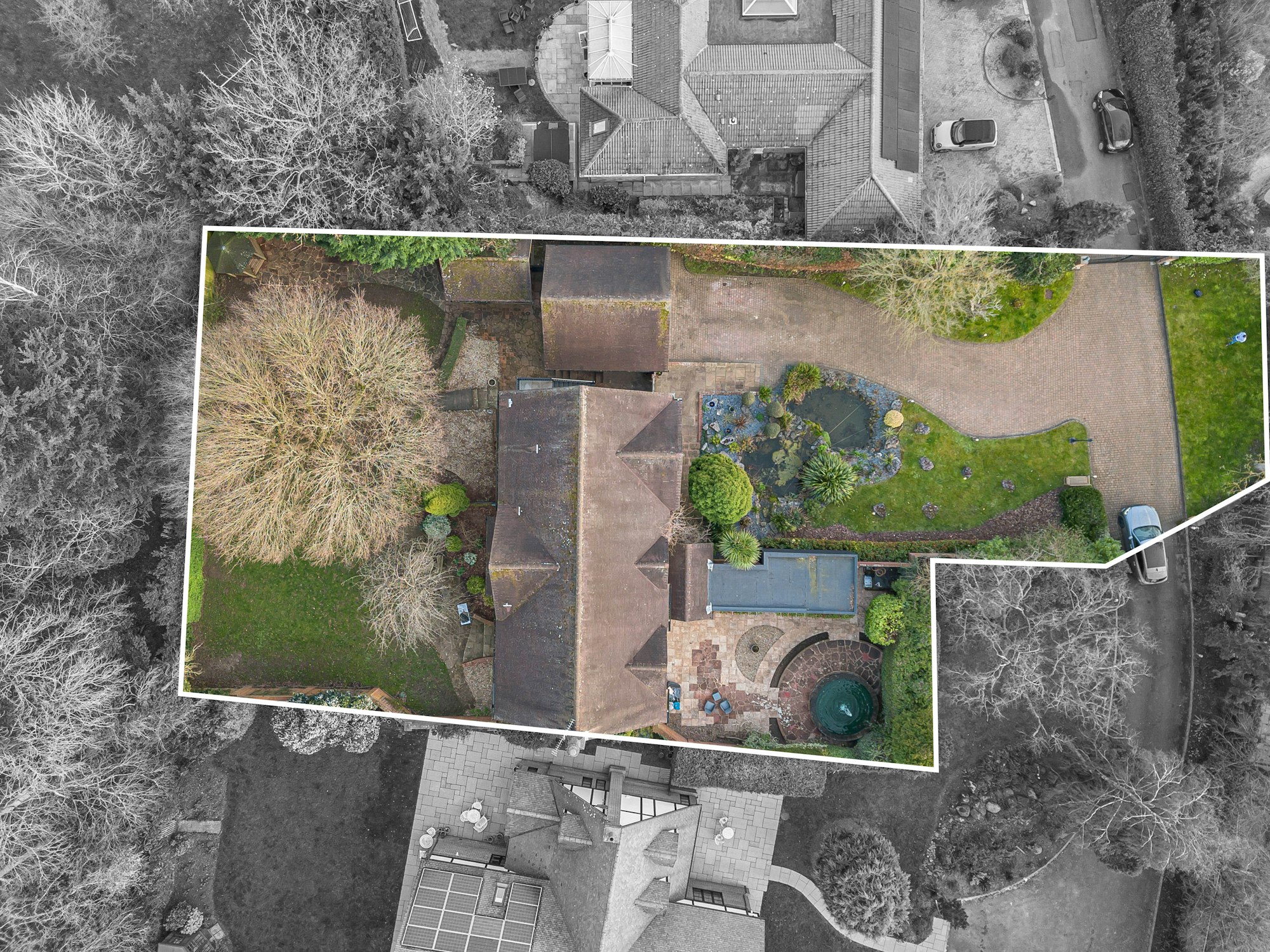 Exclusive architect-designed gated home in a peaceful cul-de-sac. Three floors of versatile living, six bedrooms, cinema/games room, landscaped gardens & woodland views.