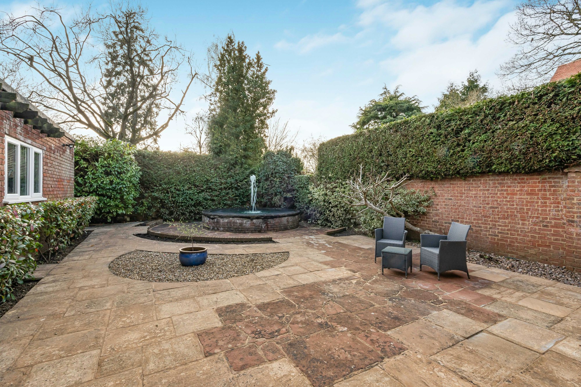 An inviting reception hall with a bespoke timber staircase leads to a galleried landing and sets the tone for the elegant living spaces. At the front is a study, perfect for those who need to work from home, whilst to the rear, a dining area with an expansive curved window offers uninterrupted views over the gardens. The double-aspect sitting room features a charming inglenook fireplace and doors opening onto both the rear garden and a private walled courtyard with its feature water fountain. The kitchen/breakfast room is fitted with high-quality in-frame shaker units by Smallbone of Devizes, combining style and practicality.