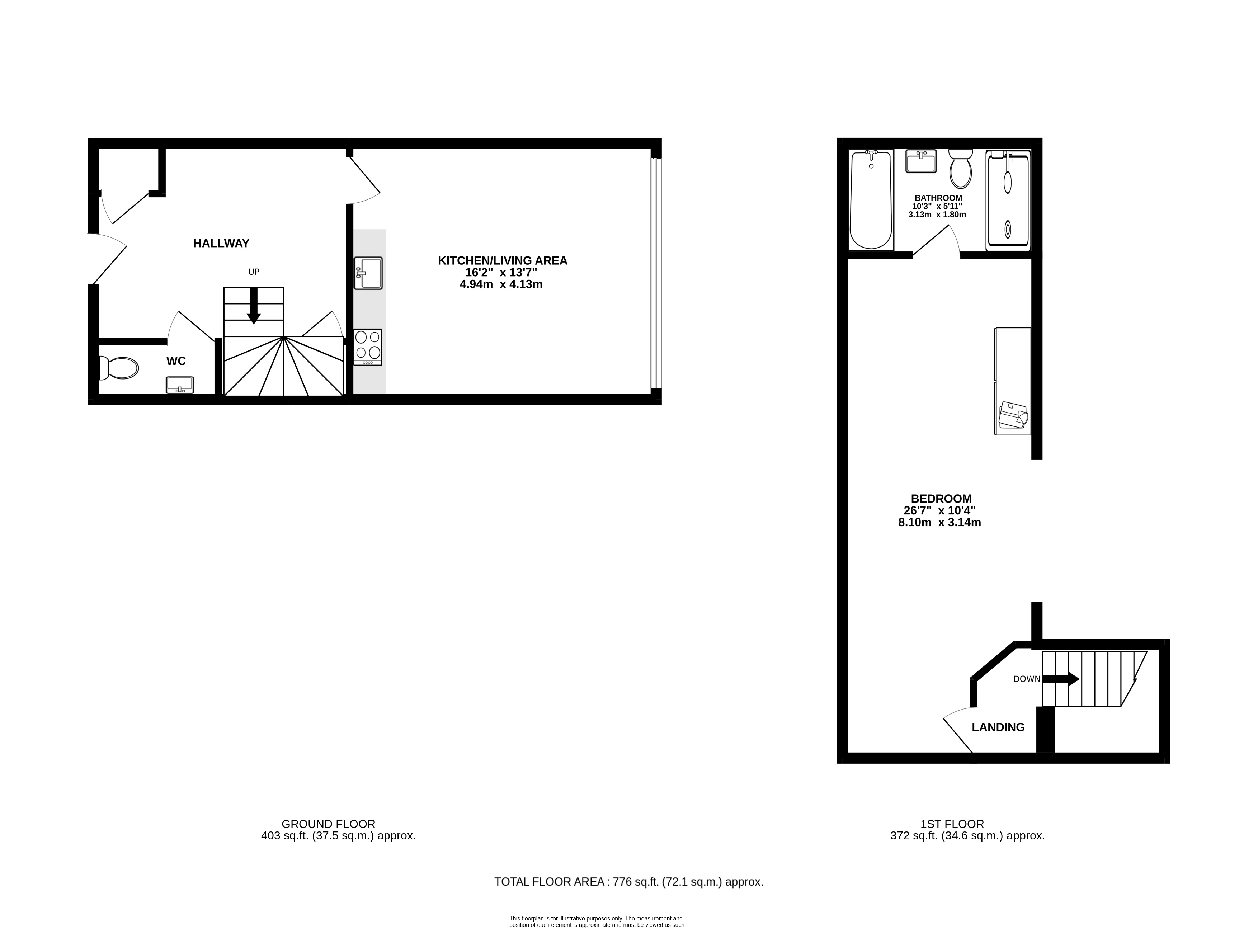 To the first floor, a landing overlooks the living space and leads to a galleried bedroom, complete with fitted wardrobes and a modern en-suite bathroom, featuring a bath, walk-in shower, wash hand basin, and WC.
