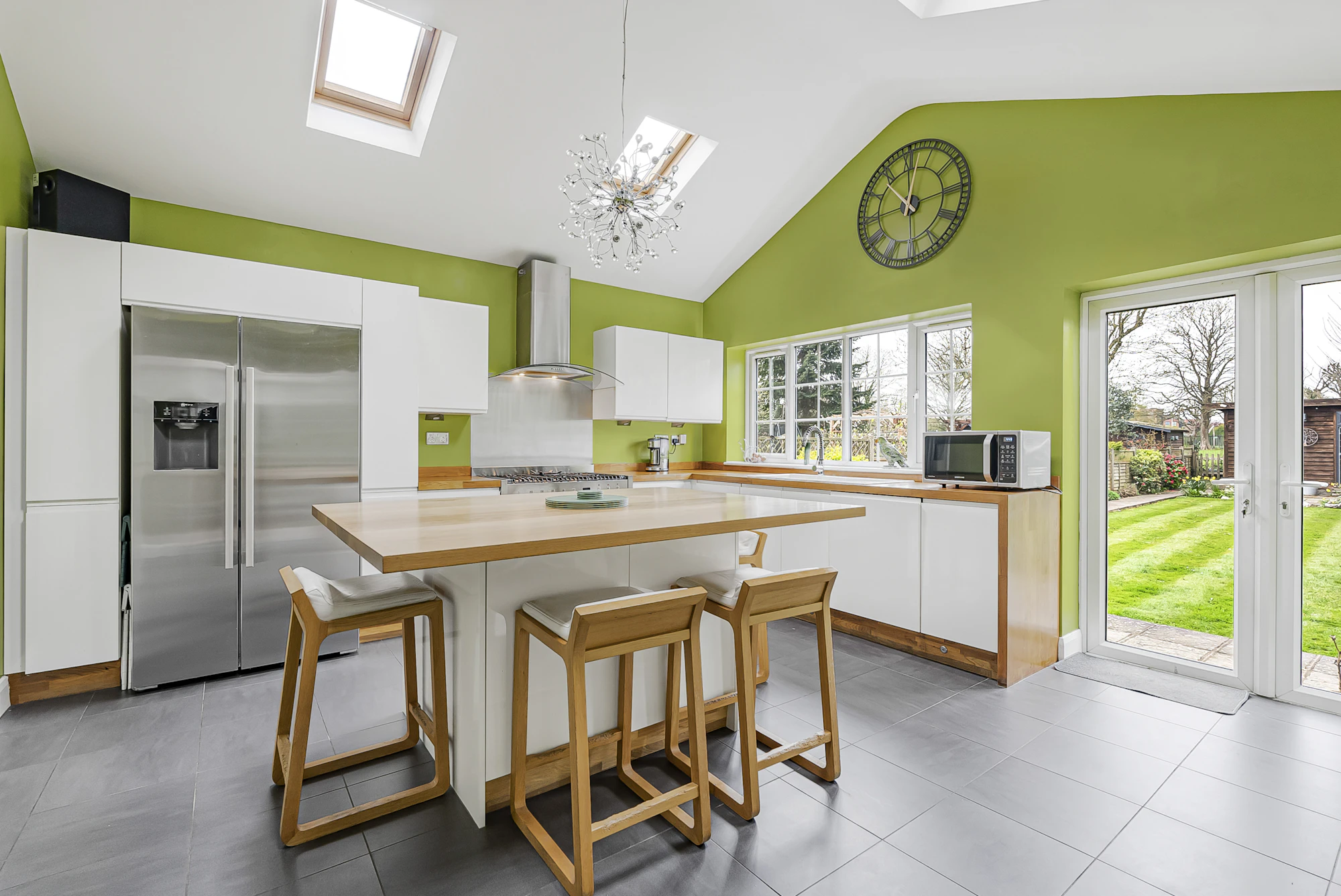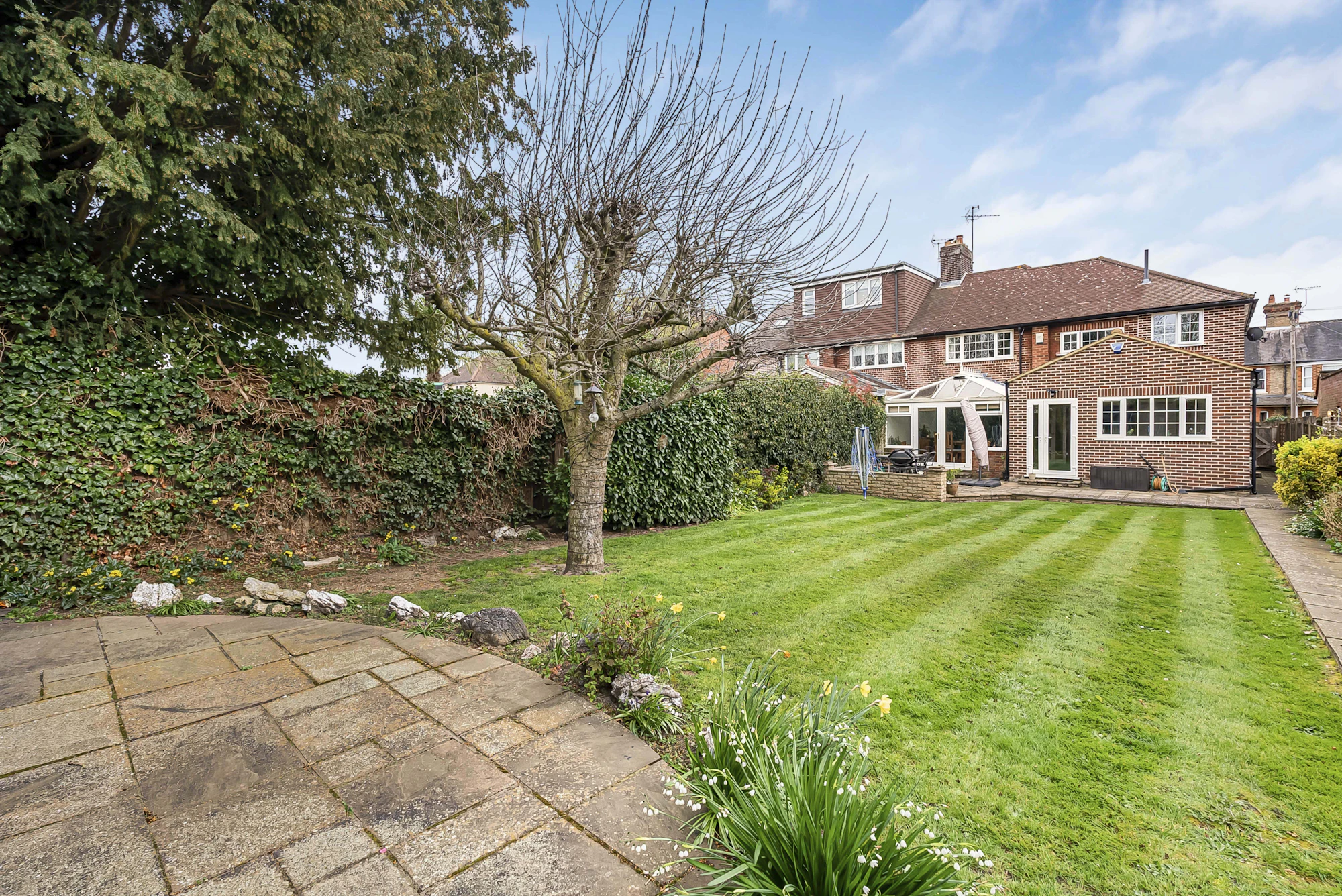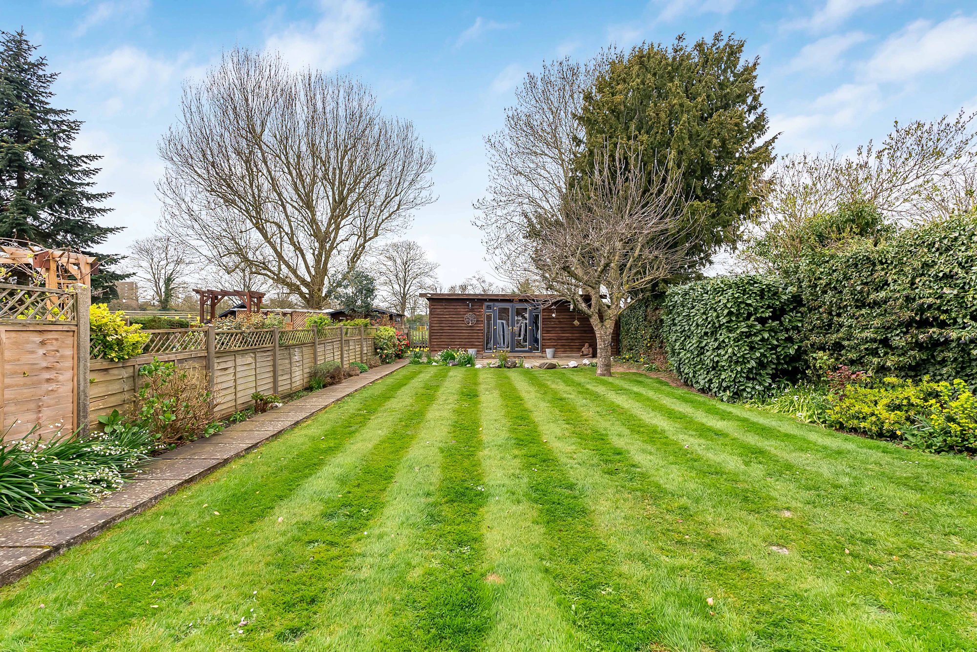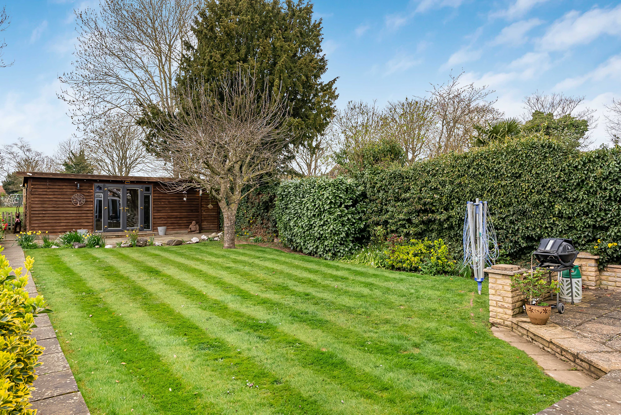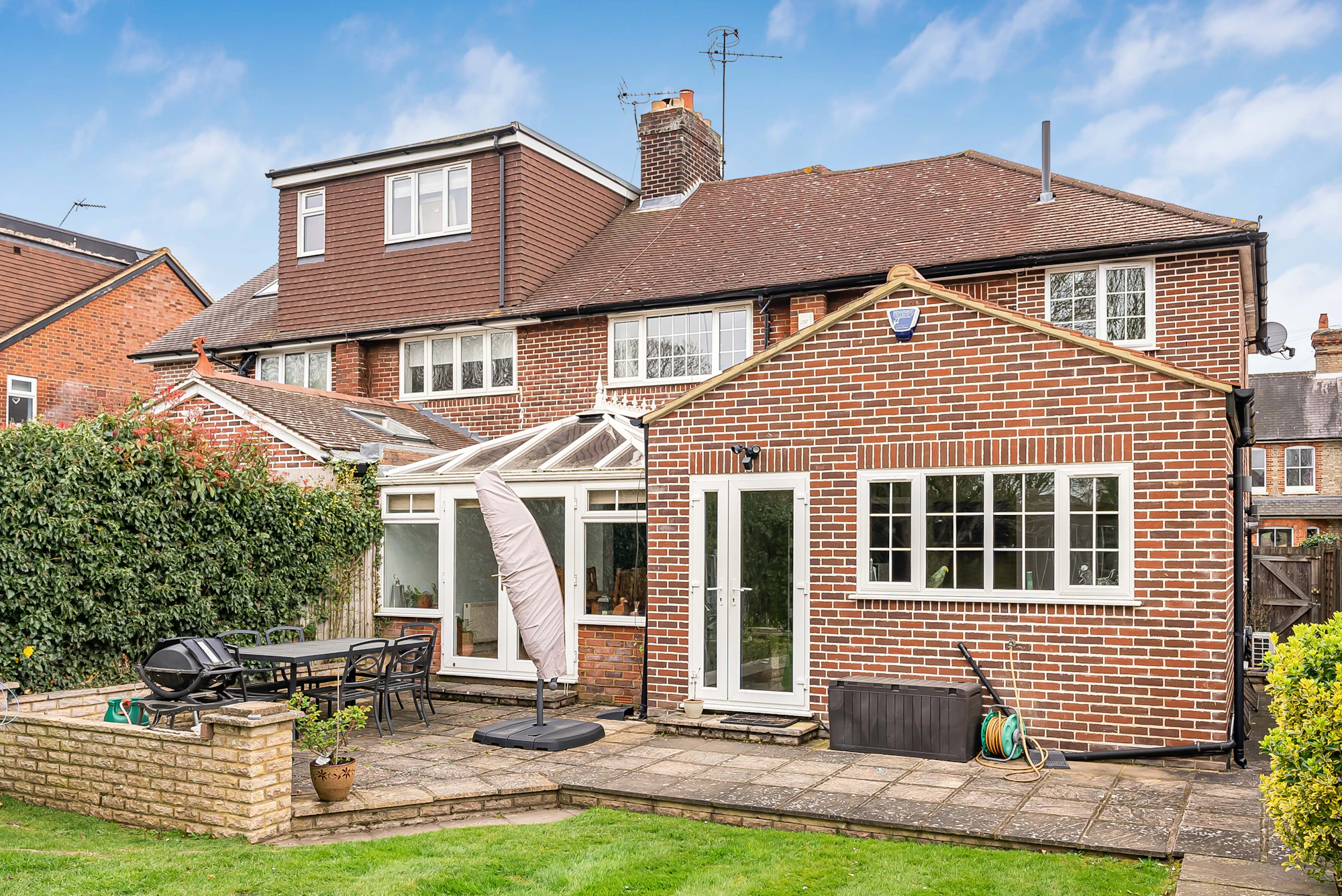 Outside and to the rear, the home enjoys a generous west-facing rear garden backing on to school fields, mainly laid to lawn with patio areas perfect for outdoor dining and entertaining.