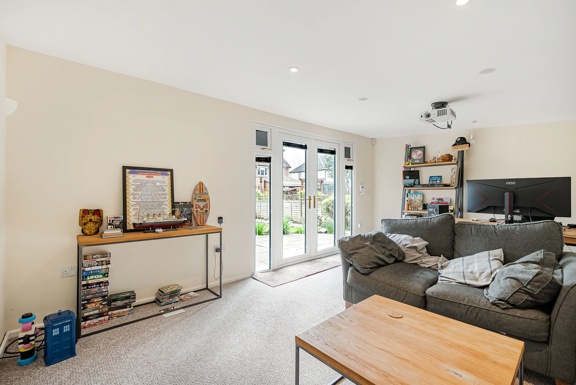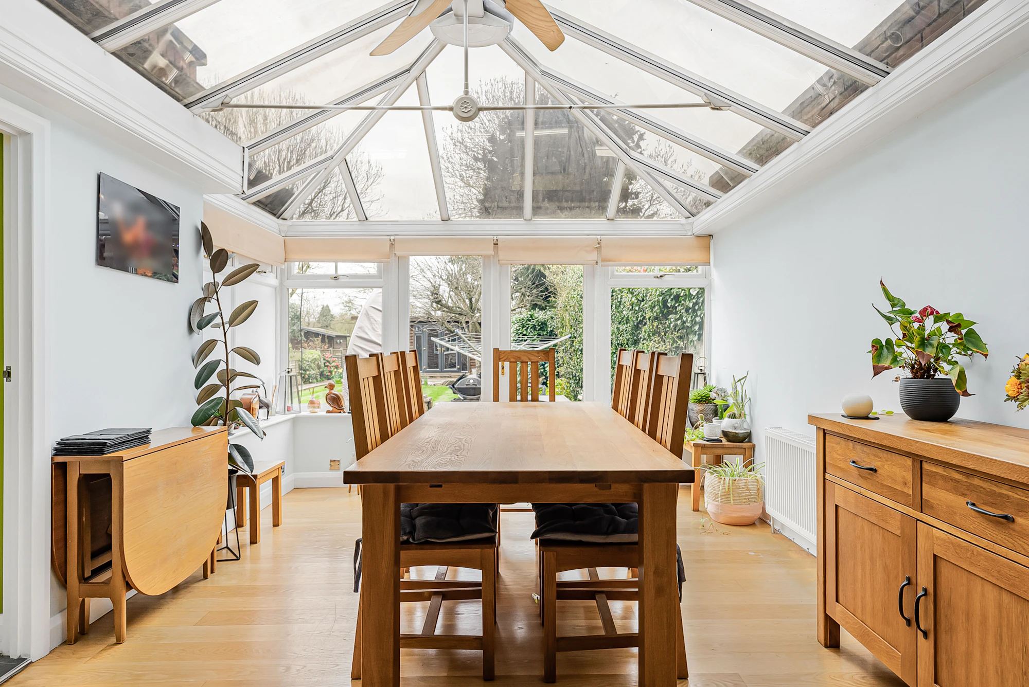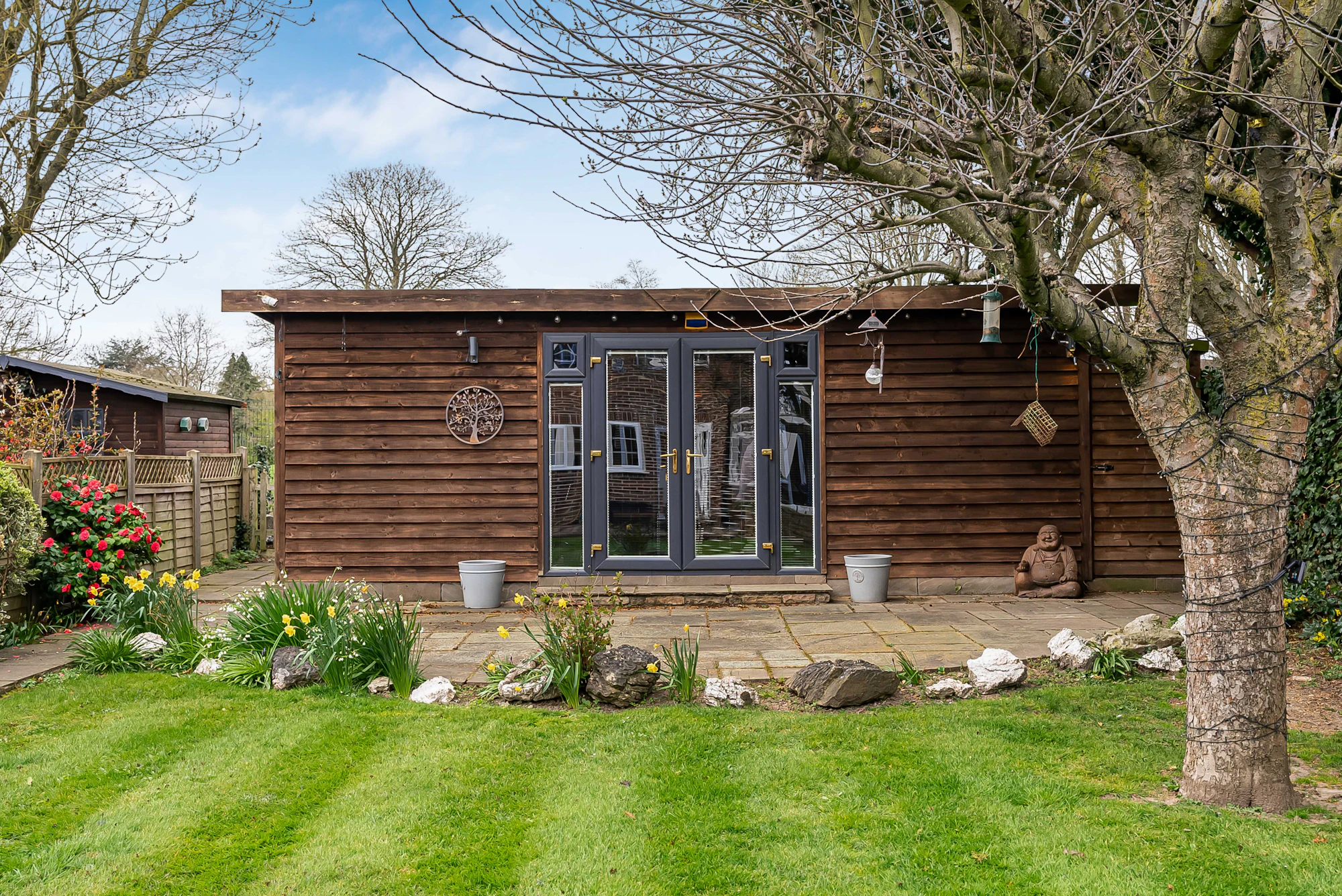 Additional benefits include a versatile outbuilding used as a home office/cinema room/studio, a sauna, EV charging point, air conditioning in selected rooms, a recently installed Vaillant boiler, a zoned alarm system with CCTV, and off-street parking for multiple vehicles via a private driveway.