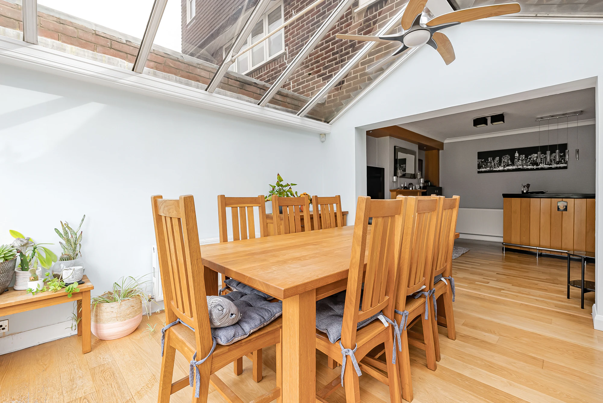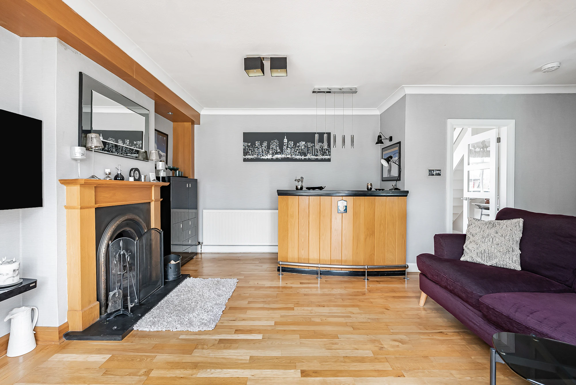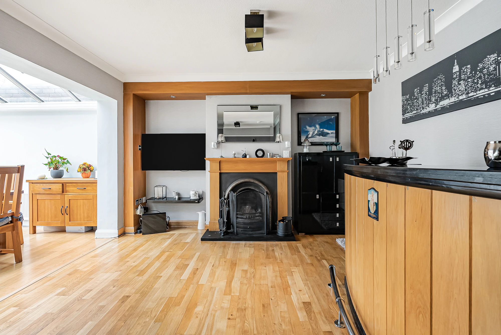 The ground floor features a welcoming entrance hallway, a generous front-facing lounge with a bay window, and a stylish family room complete with a log-burning fireplace and fitted bar—ideal for relaxing or entertaining. There is also a separate dining area with a contemporary UV-reflective roof, a modern kitchen fitted with a central island and underfloor heating, a practical utility room with WC, and an additional reception room currently used as a playroom/games room, which could easily serve as a fifth bedroom.