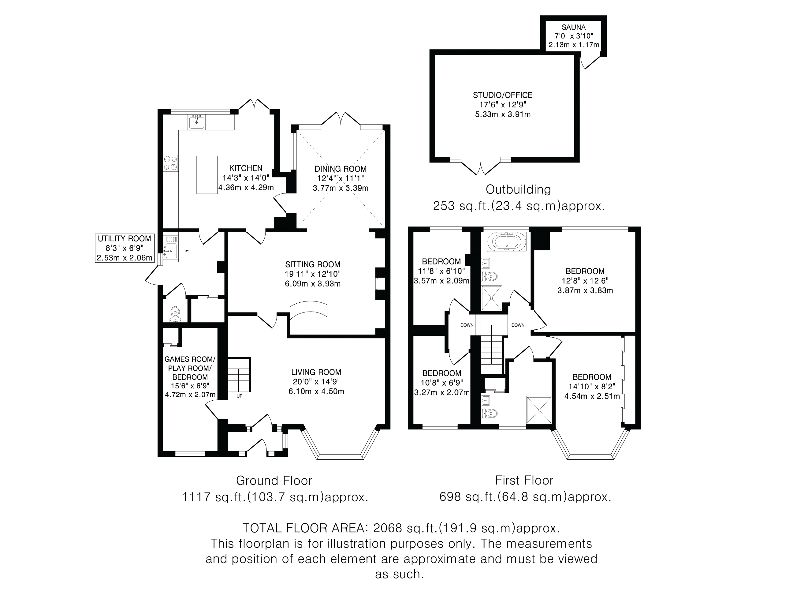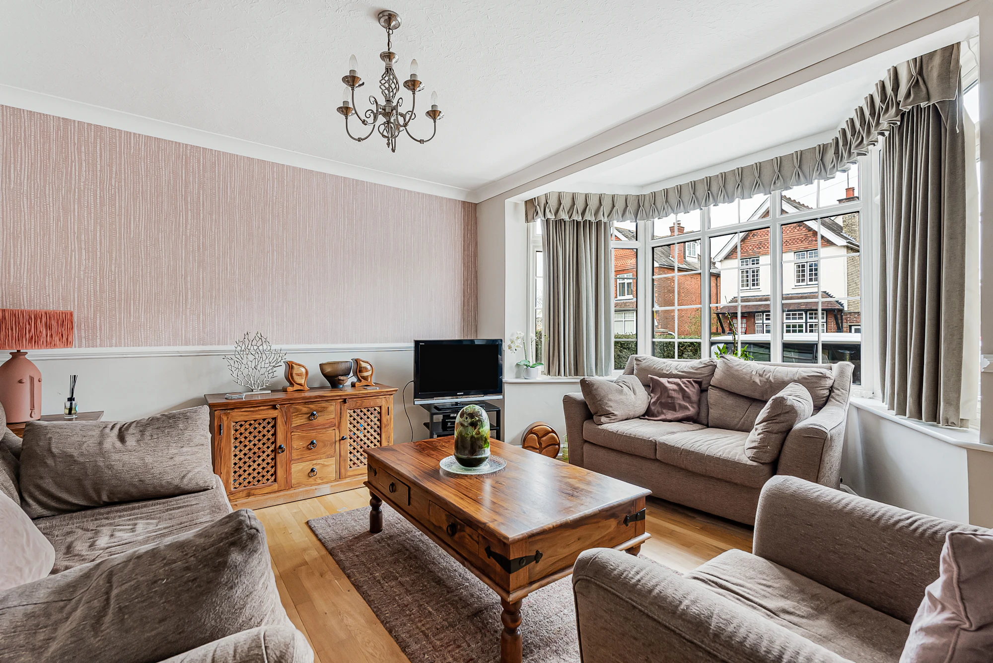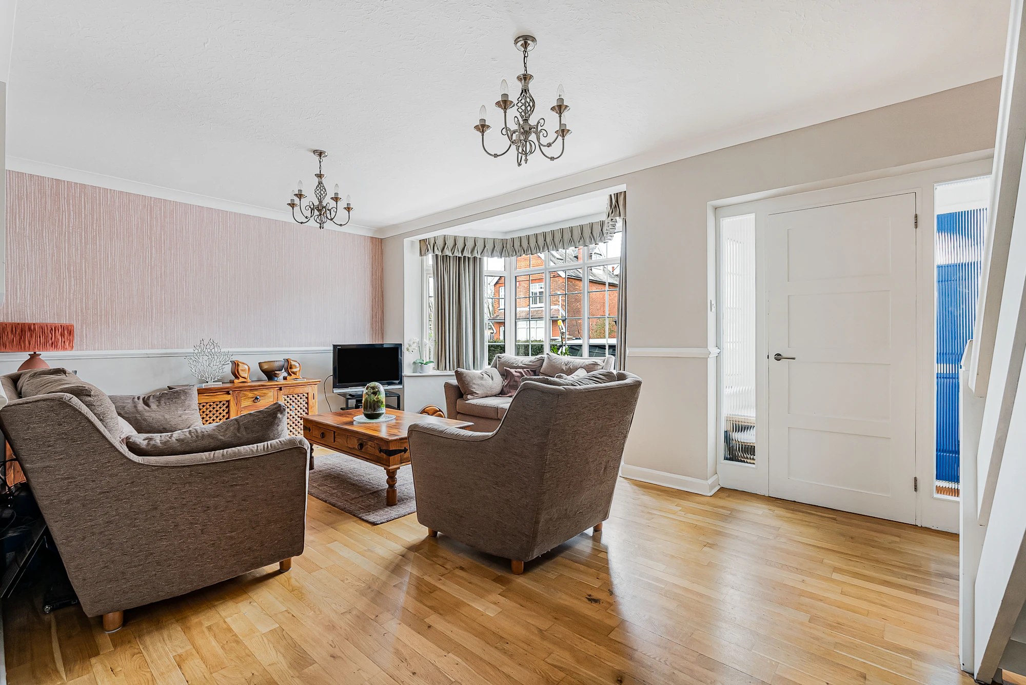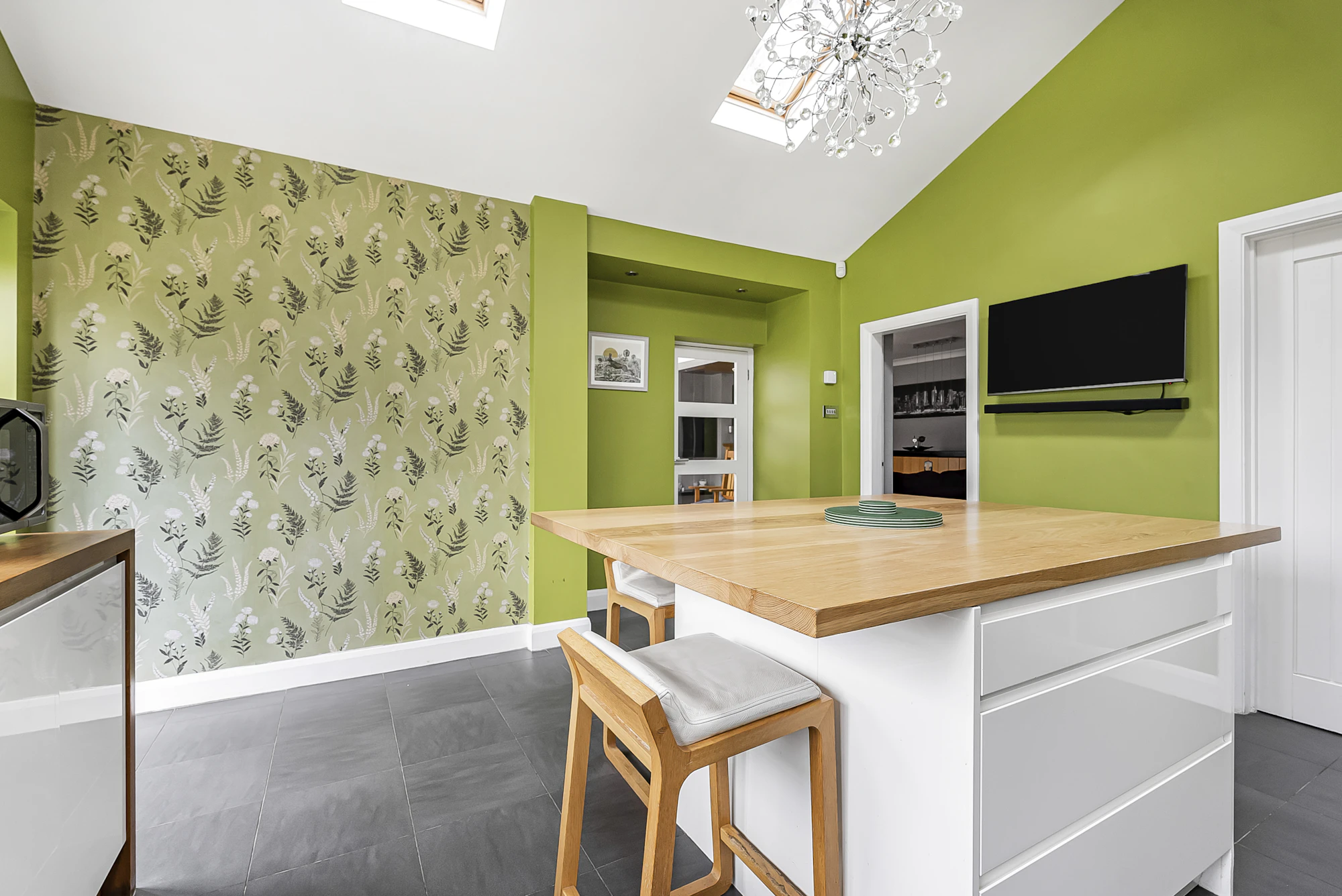 The ground floor features a welcoming entrance hallway, a generous front-facing lounge with a bay window, and a stylish family room complete with a log-burning fireplace and fitted bar—ideal for relaxing or entertaining. There is also a separate dining area with a contemporary UV-reflective roof, a modern kitchen fitted with a central island and underfloor heating, a practical utility room with WC, and an additional reception room currently used as a playroom/games room, which could easily serve as a fifth bedroom.
