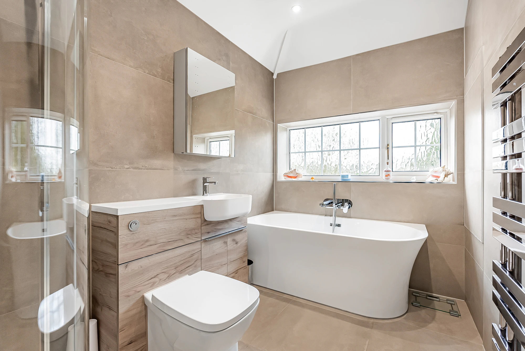 On the first floor, the property offers a spacious principal bedroom with built-in wardrobes and en-suite, a second double bedroom also with fitted storage, a further double bedroom, and a fourth single room. The accommodation is complemented by a recently upgraded four-piece family bathroom with underfloor heating.