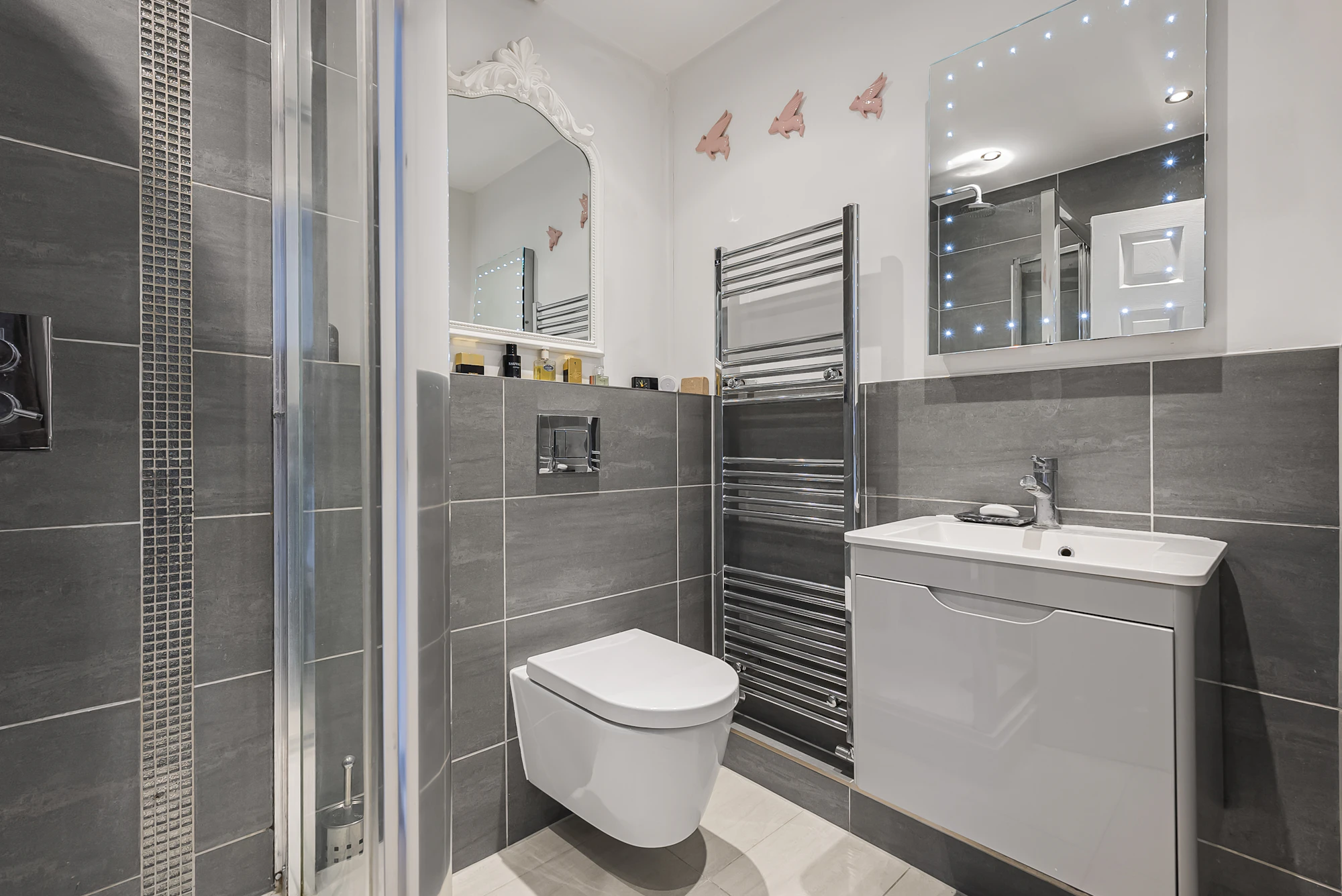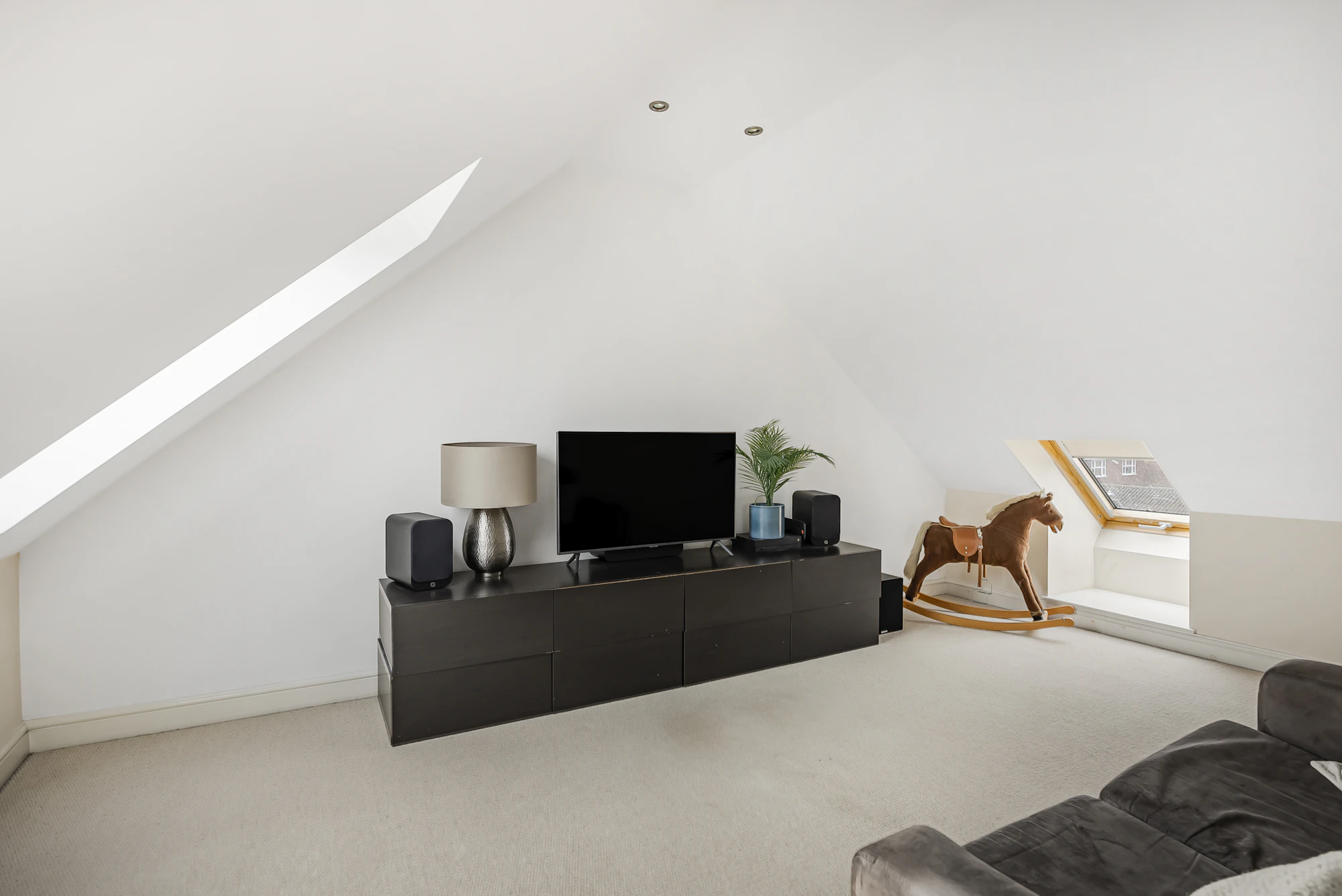 To the first floor, there are three well-proportioned bedrooms, including a superb principal bedroom complemented by a stylish modern en suite. The second floor hosts a versatile and spacious room, currently utilised as a further lounge and office space but offers flexibility for a fourth bedroom, guest suite or playroom.