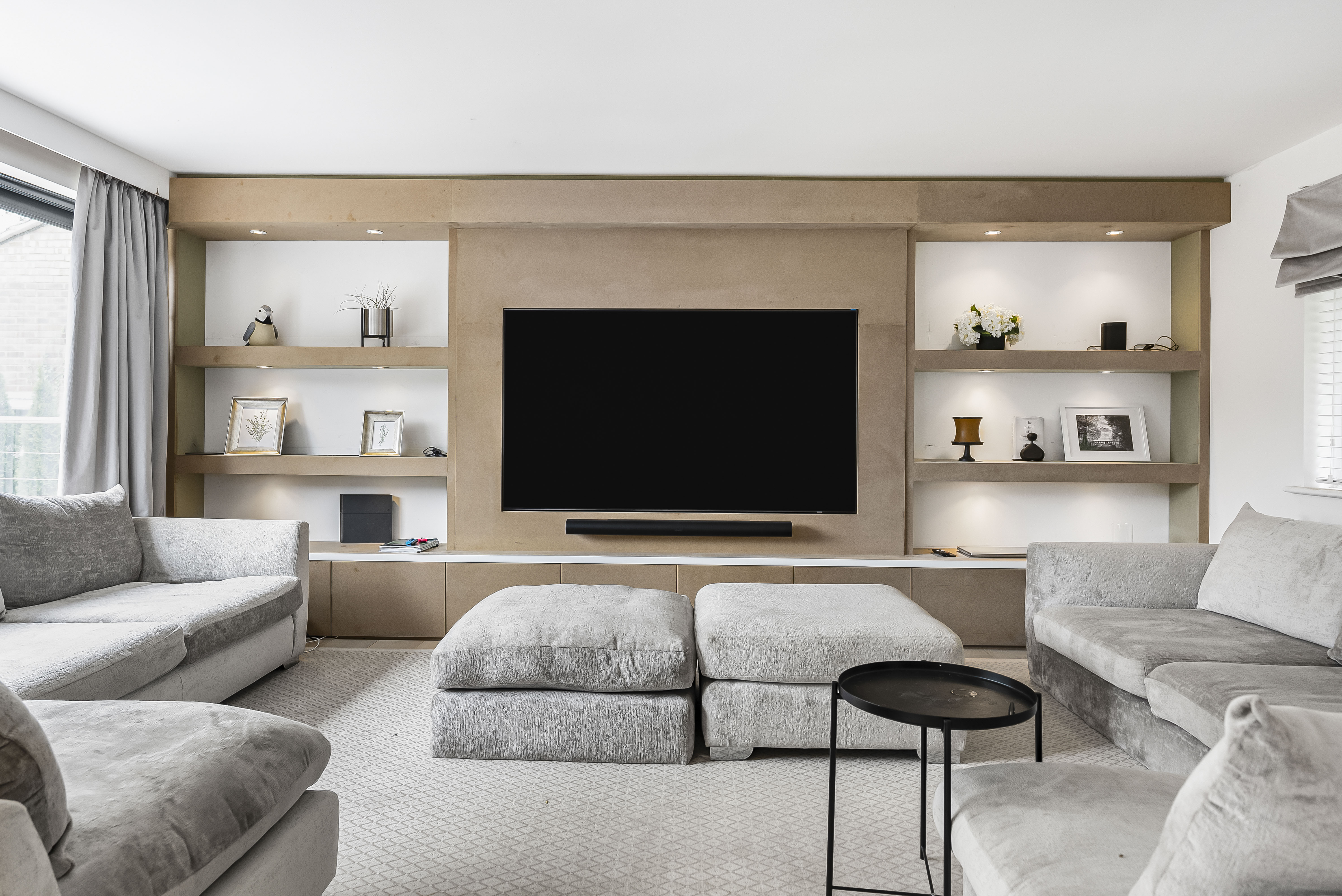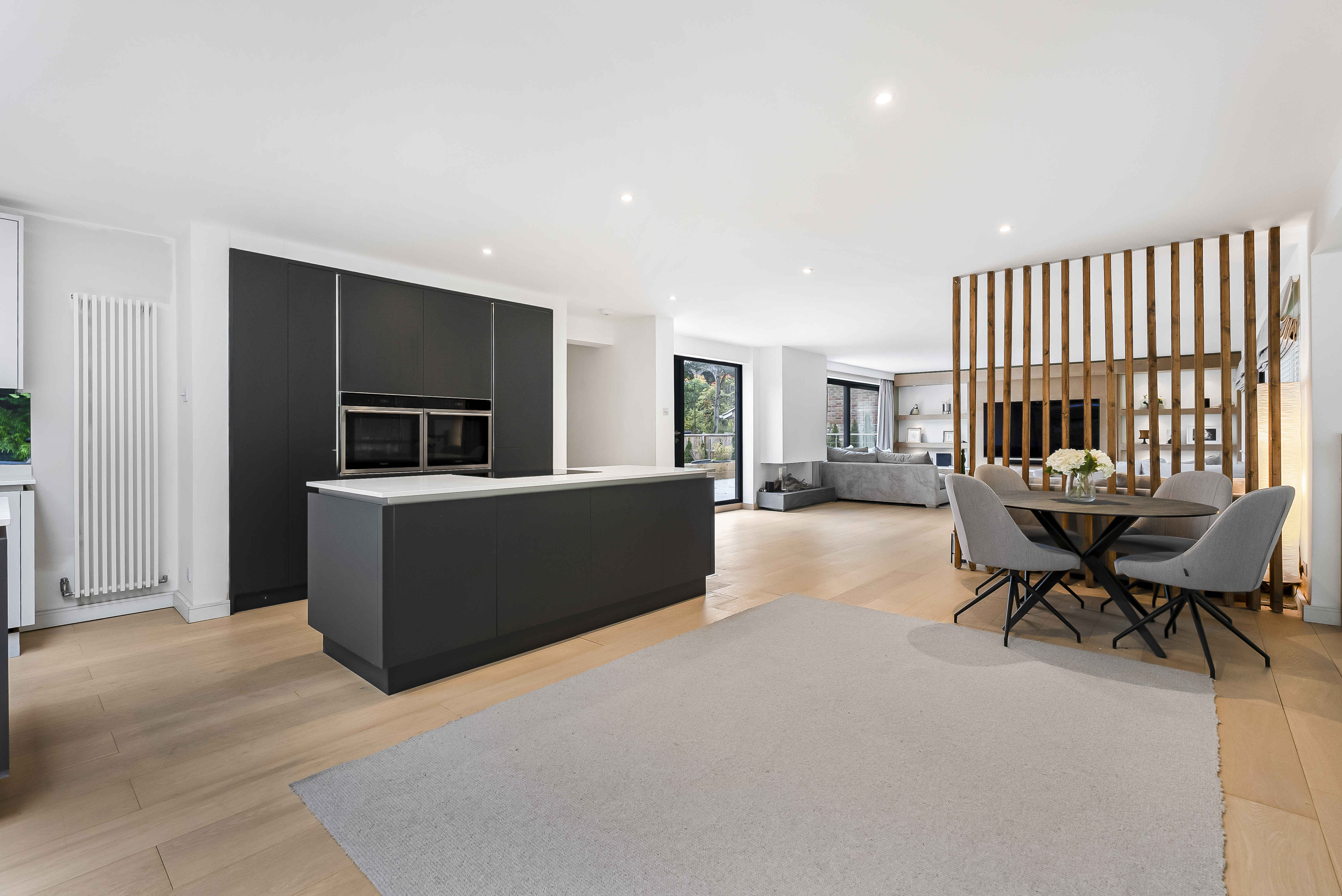 A stylish slatted wooden wall subtly defines the adjoining living area, where a contemporary media wall and access to the balcony create the perfect setting for relaxation and entertaining.