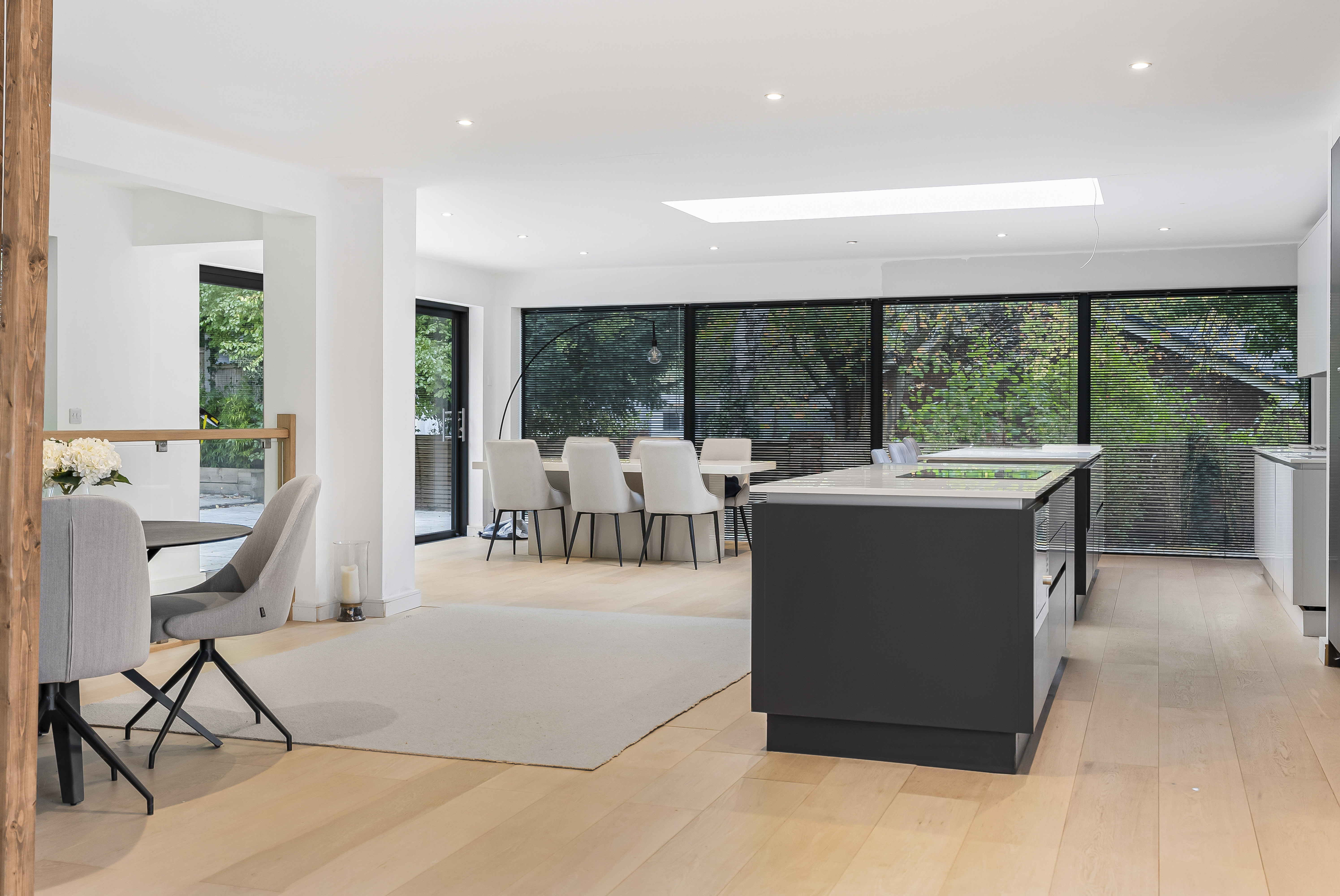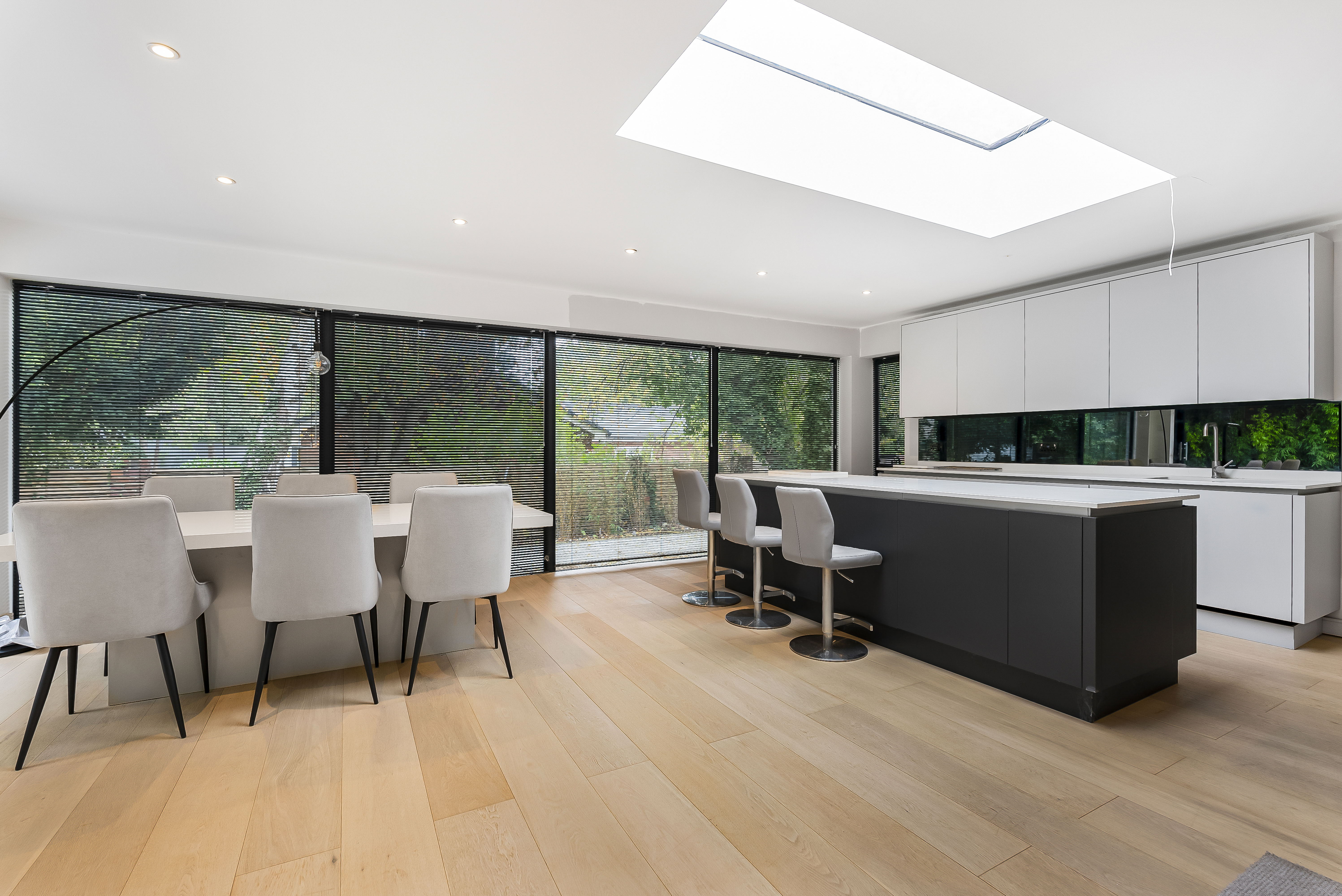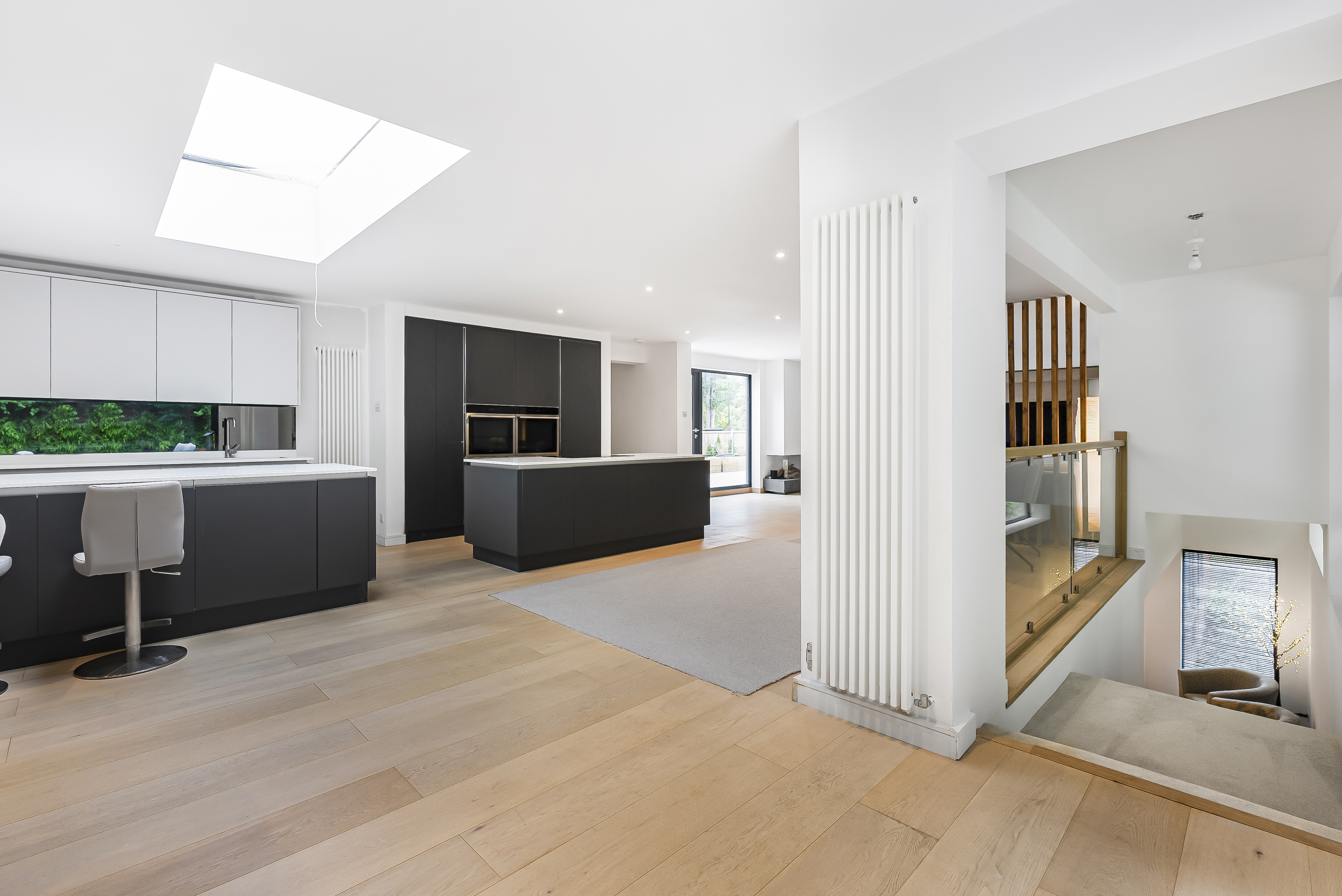 A staircase ascends to the first floor, where the property truly comes into its own. Here, an extraordinary open-plan room stretches over 55ft, bathed in natural light from every angle and offering panoramic views across the gardens. The show-stopping kitchen is a chef’s dream, featuring abundant cabinetry, twin granite-topped islands with a breakfast bar, double ovens, and a full complement of integrated appliances.