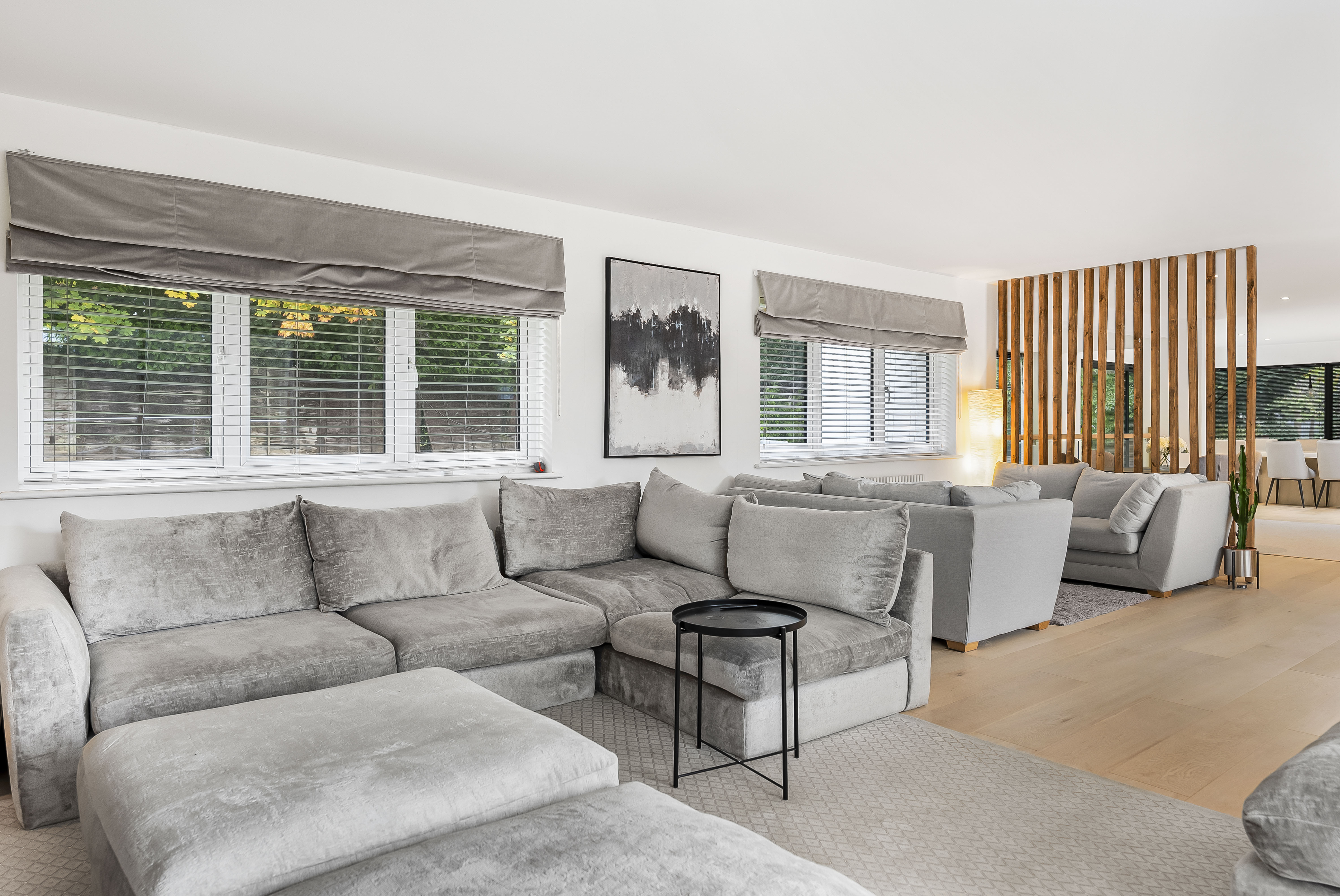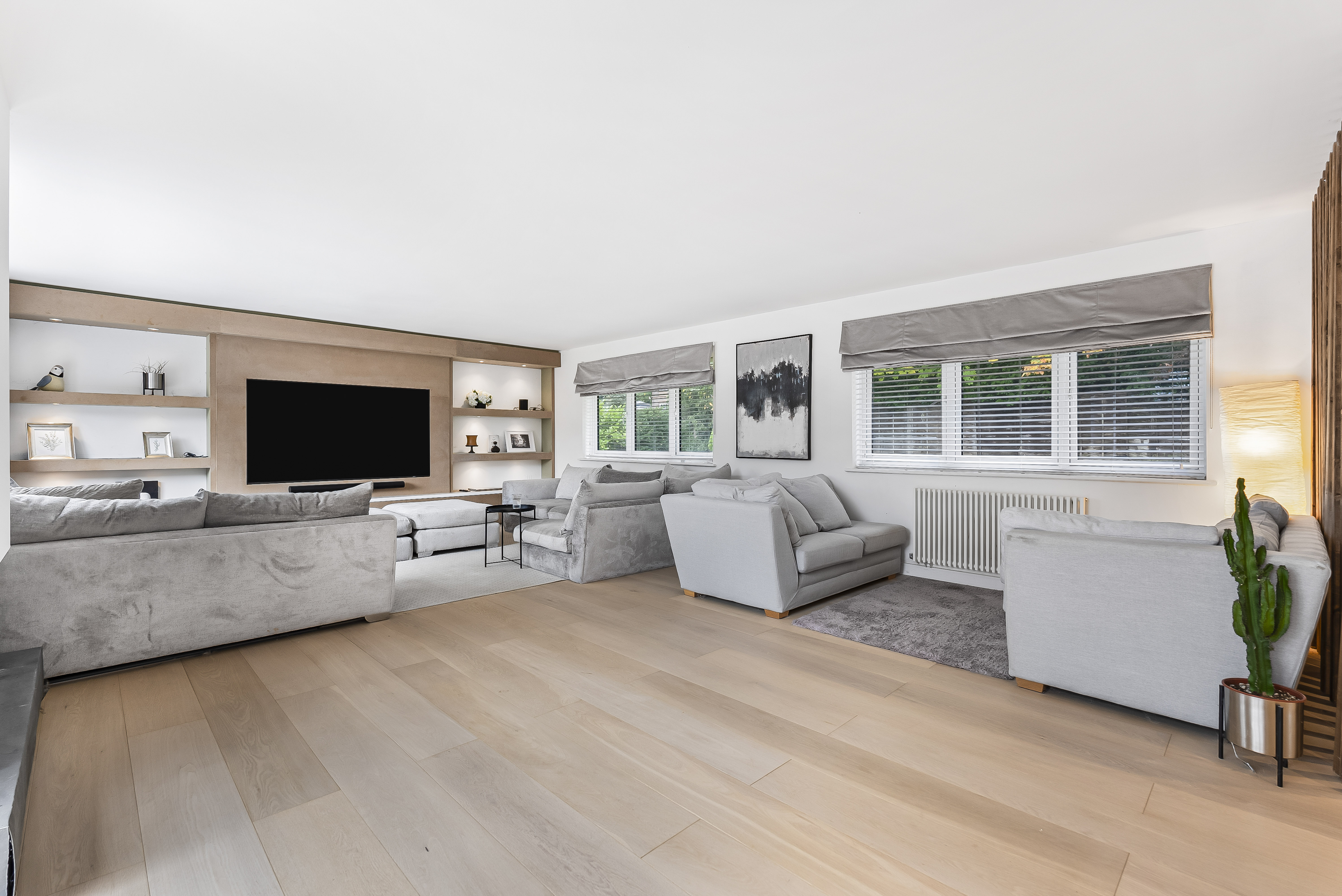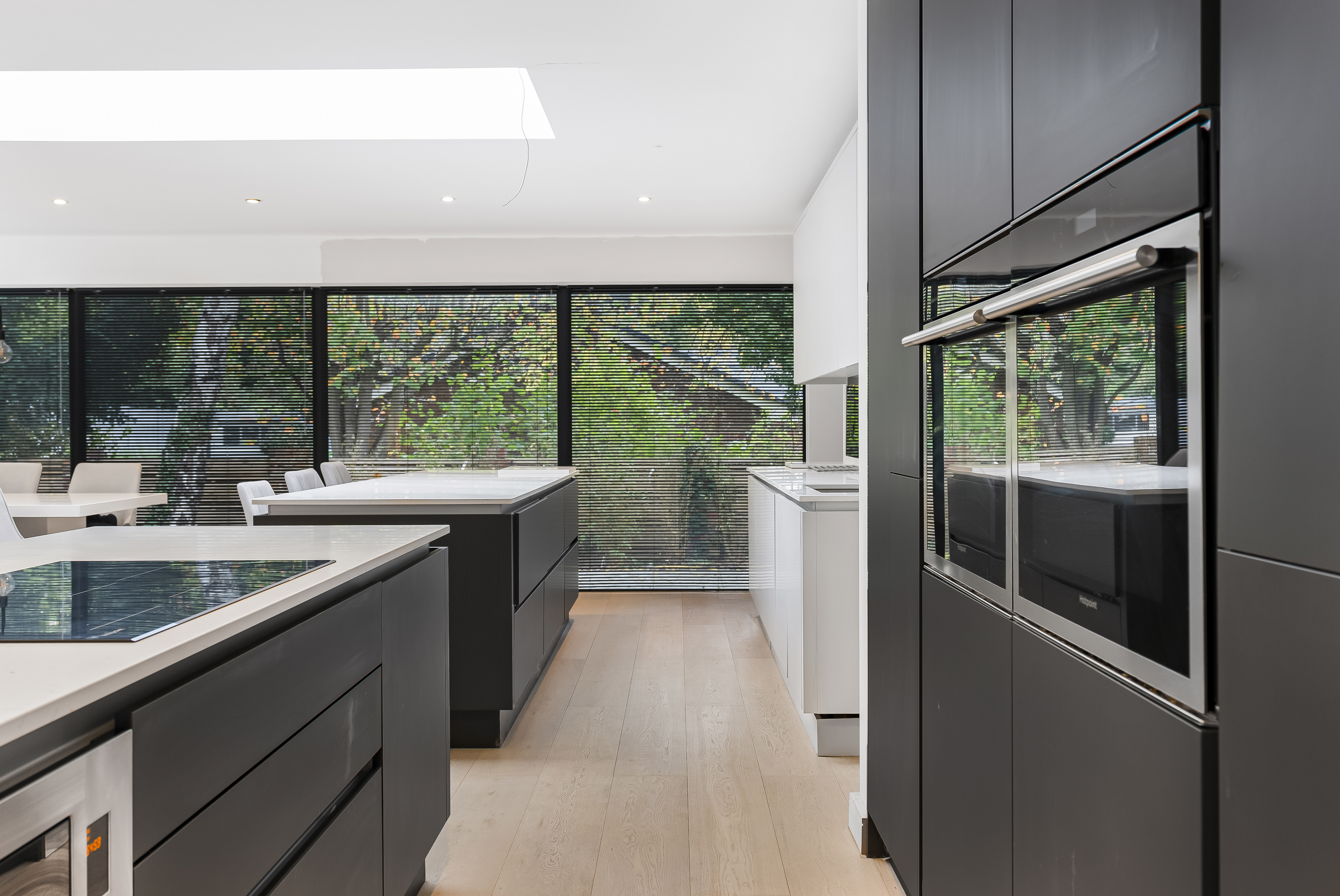 A staircase ascends to the first floor, where the property truly comes into its own. Here, an extraordinary open-plan room stretches over 55ft, bathed in natural light from every angle and offering panoramic views across the gardens. The show-stopping kitchen is a chef’s dream, featuring abundant cabinetry, twin granite-topped islands with a breakfast bar, double ovens, and a full complement of integrated appliances.