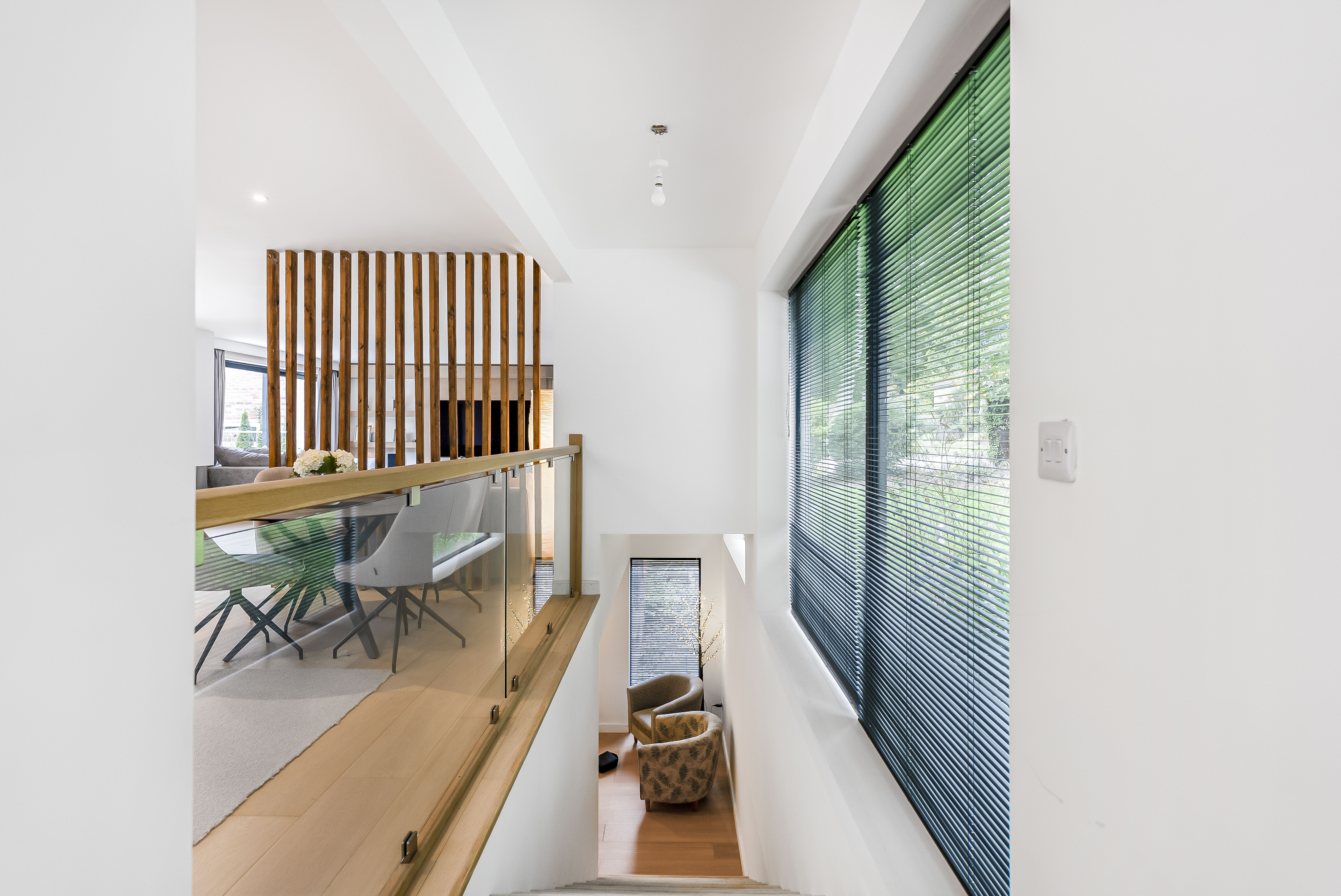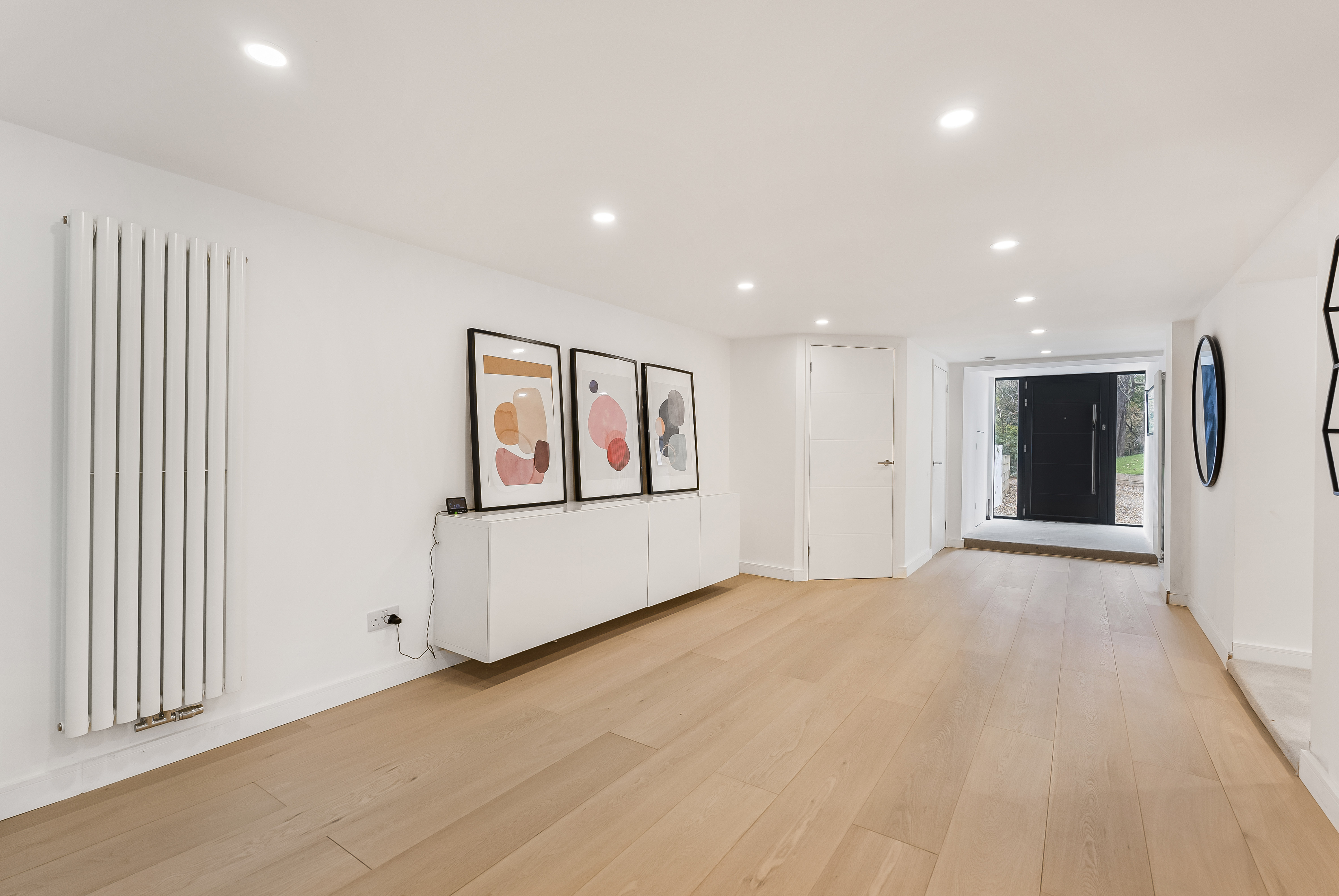 The central hallway leads to the private accommodation, including an impressive principal suite with fitted wardrobes and a luxurious four-piece en-suite bathroom. Two further bedrooms are served by a sleek, modern shower room.