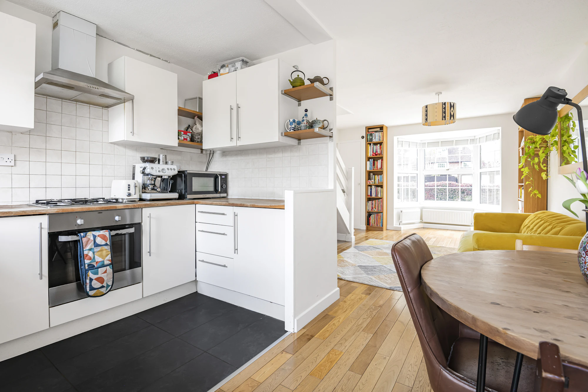 The property comprises a fitted kitchen opening to the main reception area, which has a bay window to the front and wood floors.