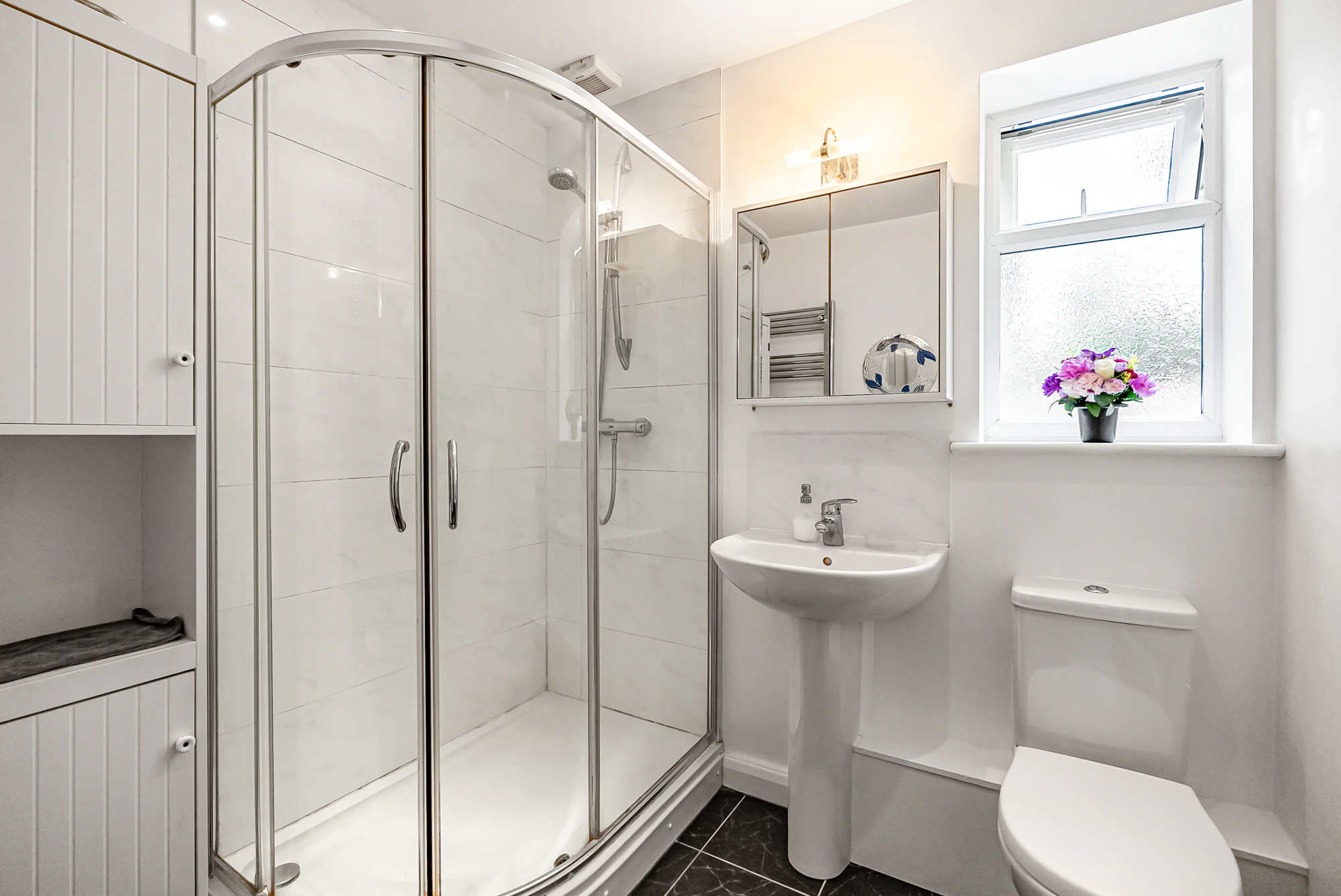 The principal residence opens into a well-appointed kitchen and an impressive 21ft dual-aspect sitting room. Flooded with natural light, this reception space features doors opening directly onto the rear garden, creating a seamless connection between indoor and outdoor living. The main accommodation further comprises three bedrooms, including a spacious main suite with en-suite bathroom, alongside a versatile third bedroom ideally suited for use as a study or home office. A contemporary family shower room completes this section of the home.