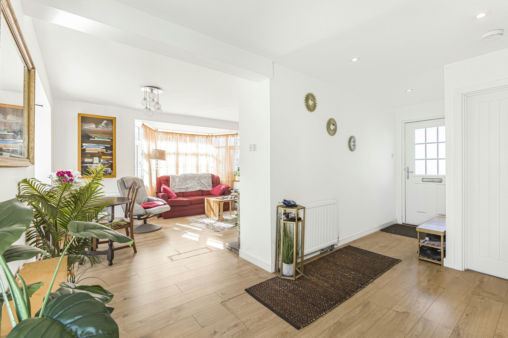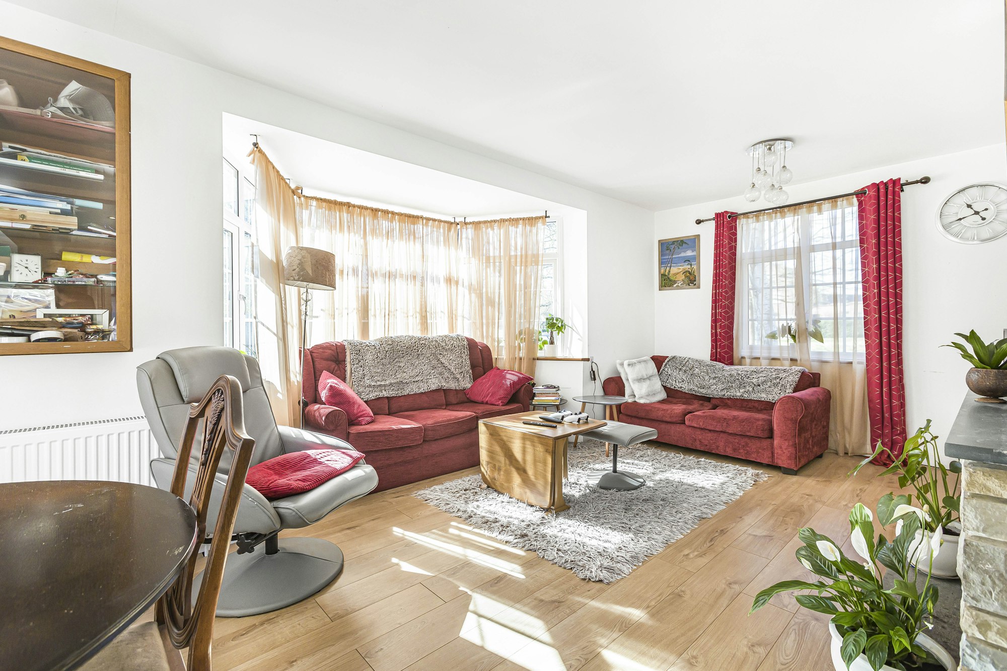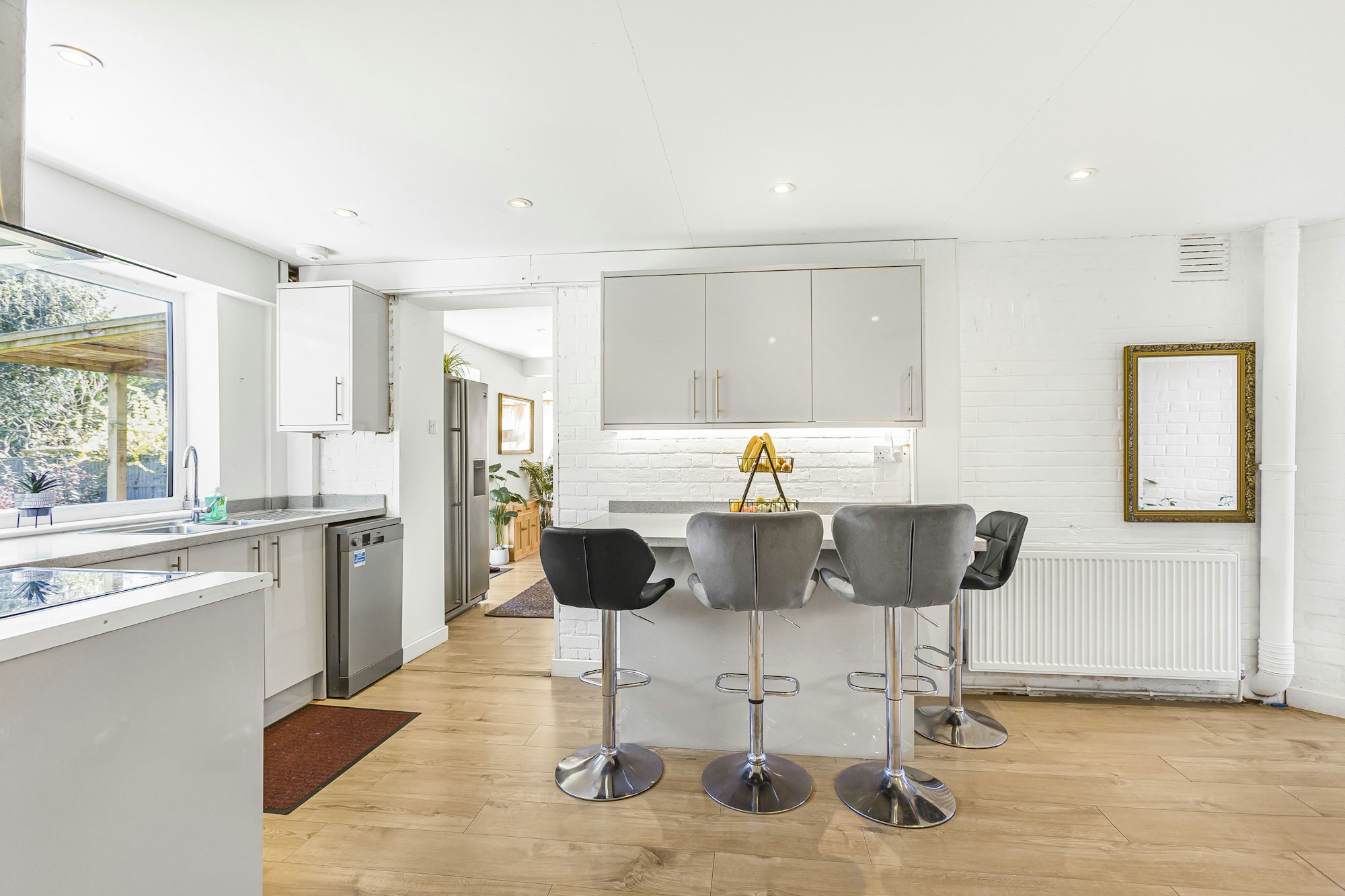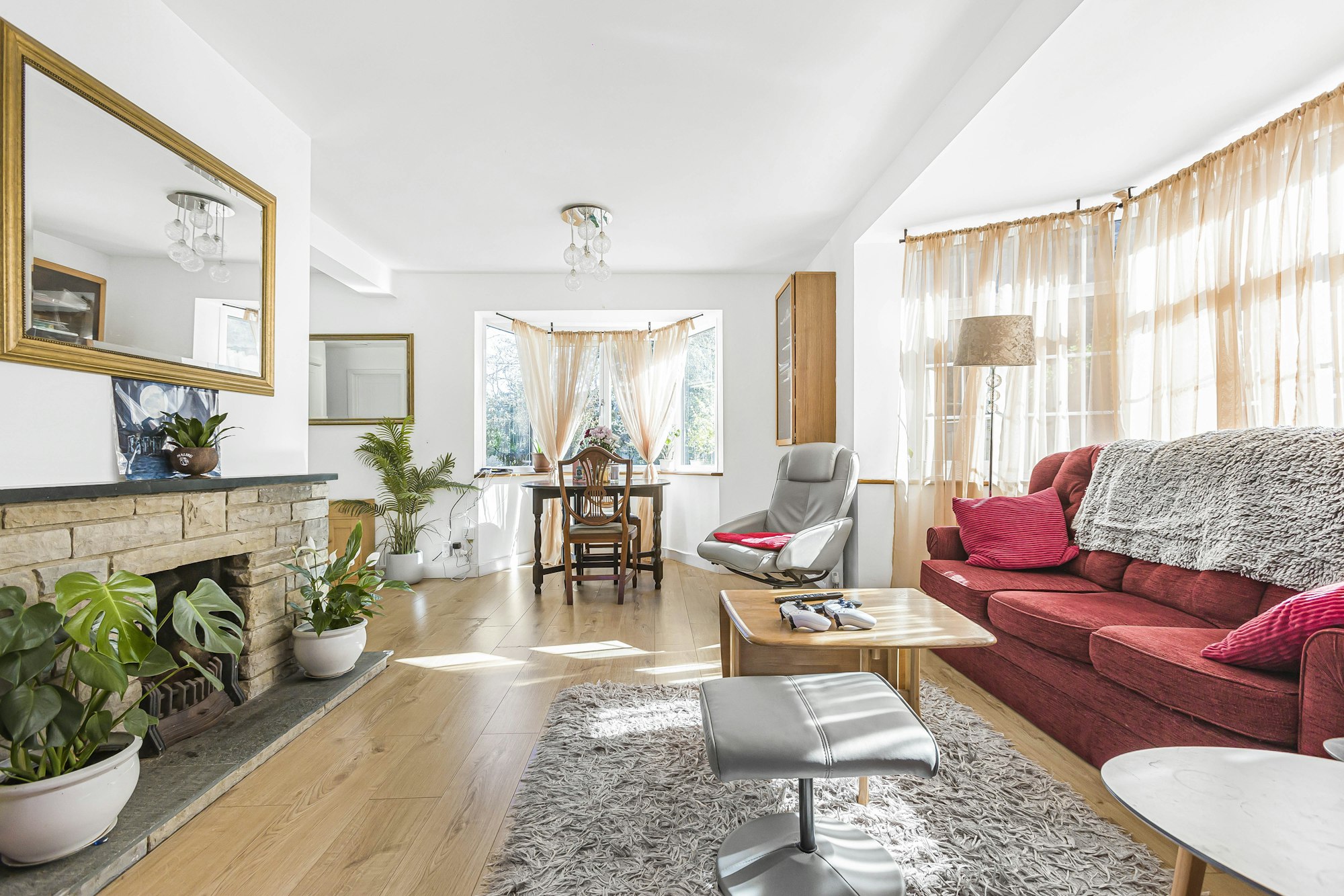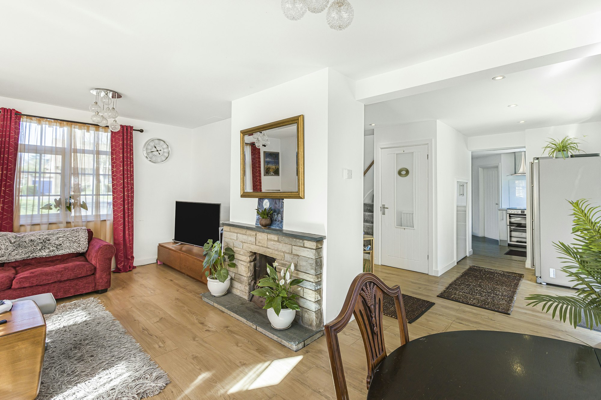 Upon entering, the welcoming entrance hall opens through into a fabulously bright living/dining room. With a feature fireplace, this triple aspect room has a window to the front and bay windows to rear and side. There are also double doors onto the garden.