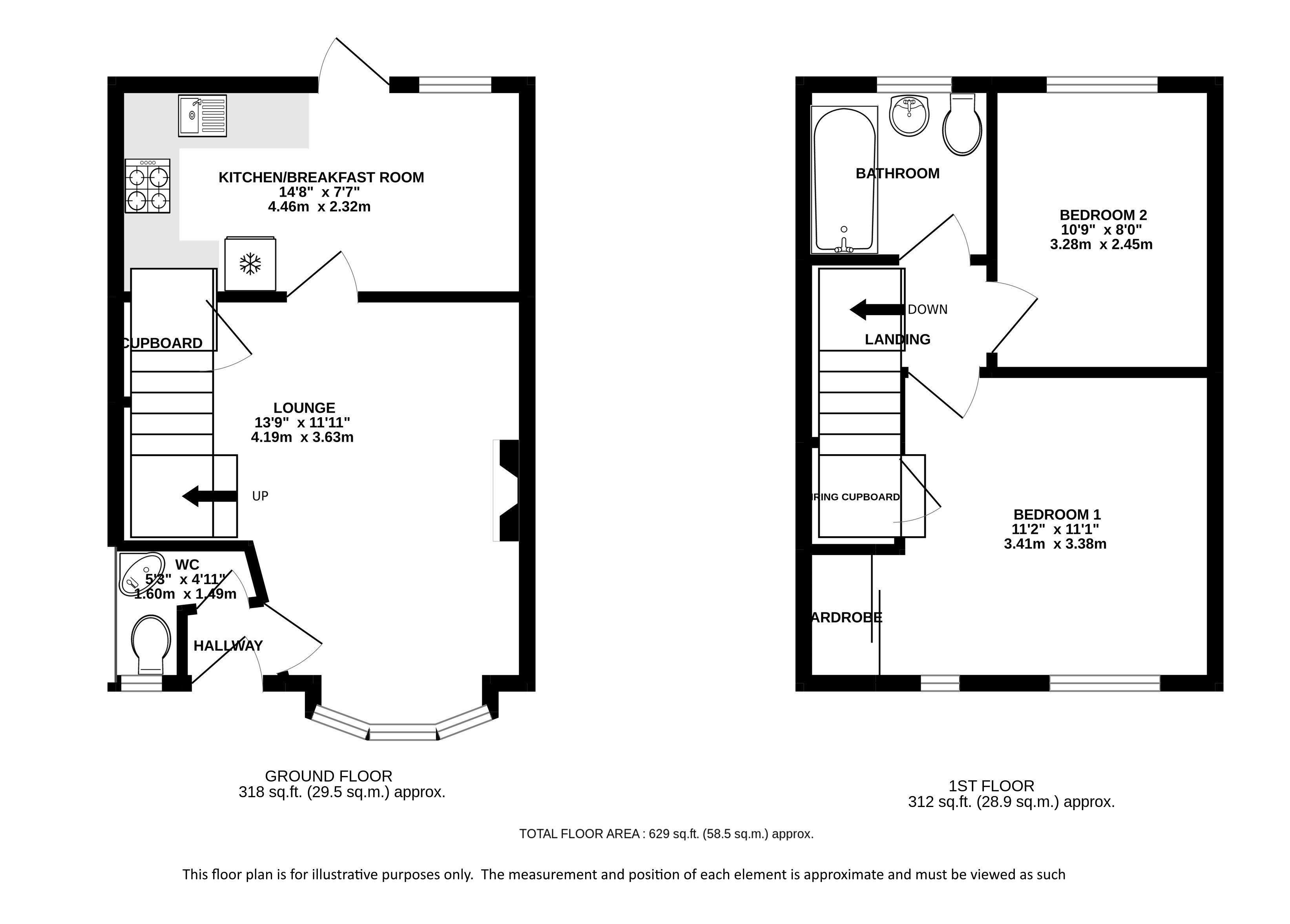 The first floor provides a spacious principal bedroom with front aspect windows and a built-in wardrobe. A generously sized second bedroom is also large enough to accommodate a double bed and wardrobe and both are serviced by a family bathroom which has a bath with shower-over, wc and hand-wash basin. There is a hatch for access into the loft from the landing.