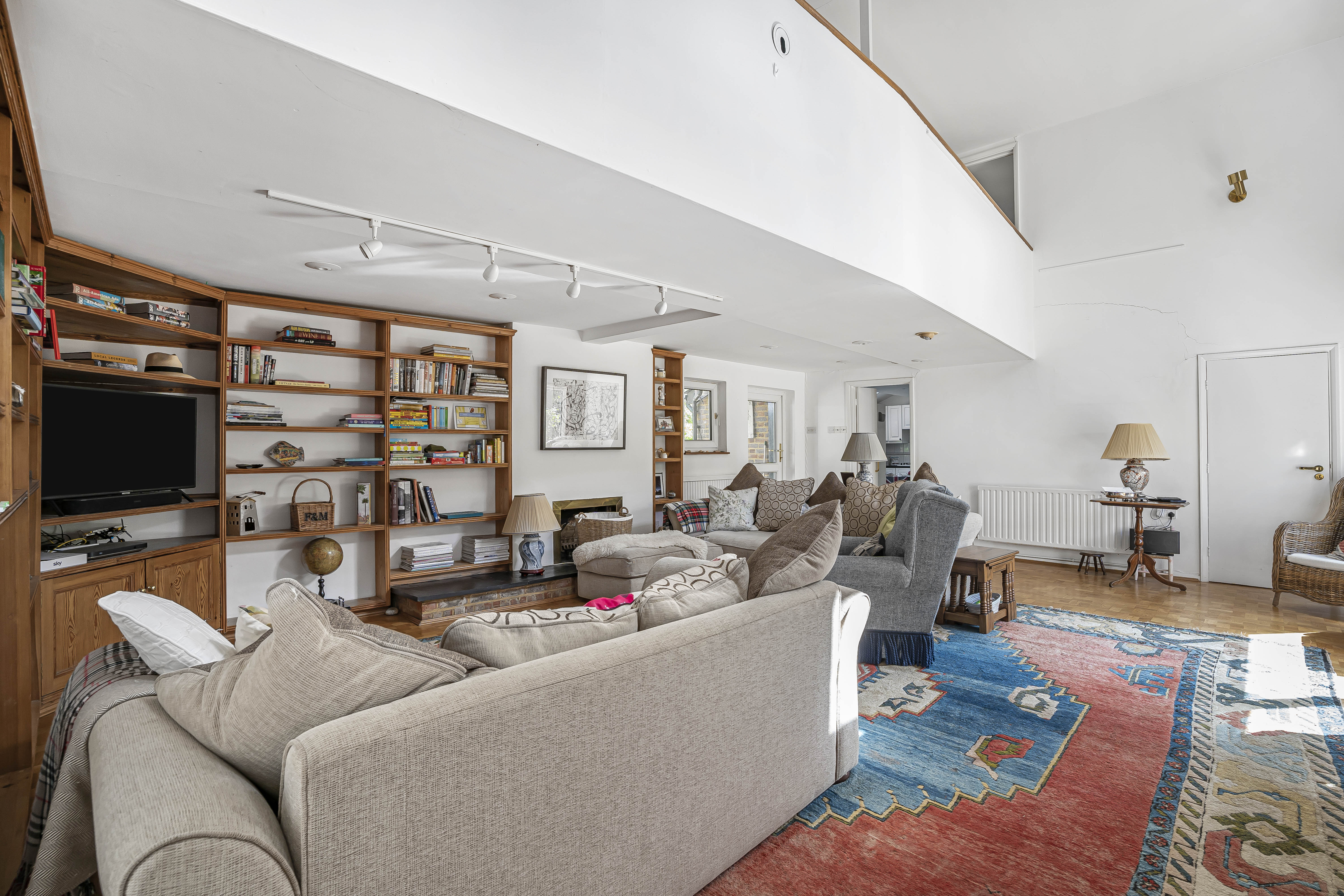 Upstairs, a mezzanine-style landing leads to four further bedrooms and a family bathroom, creating a balanced layout of space and comfort.