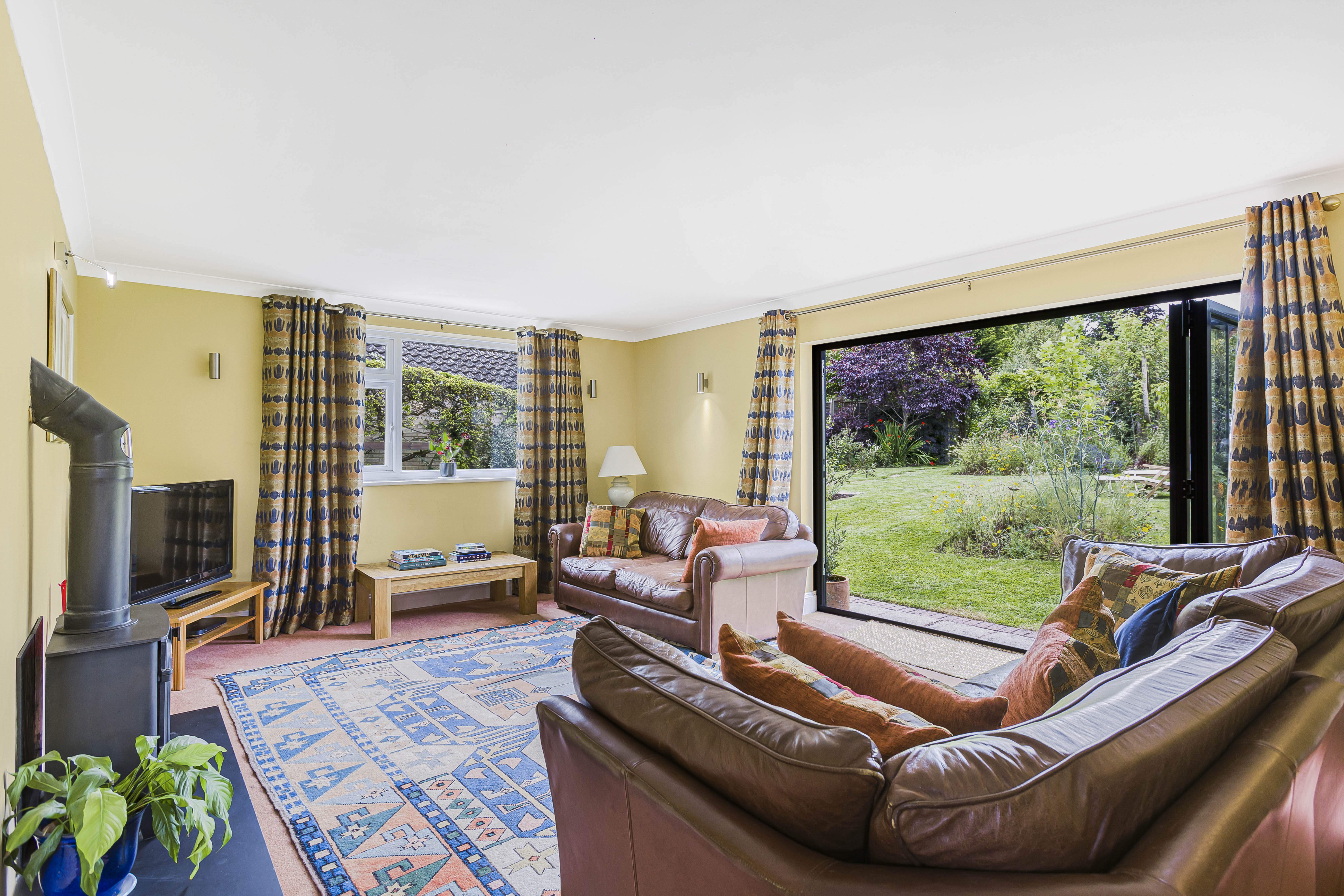 A spacious living room complete with feature fireplace with multi-fuel stove is bathed in natural light from dual aspect windows and bi-folding doors leading onto the rear garden.