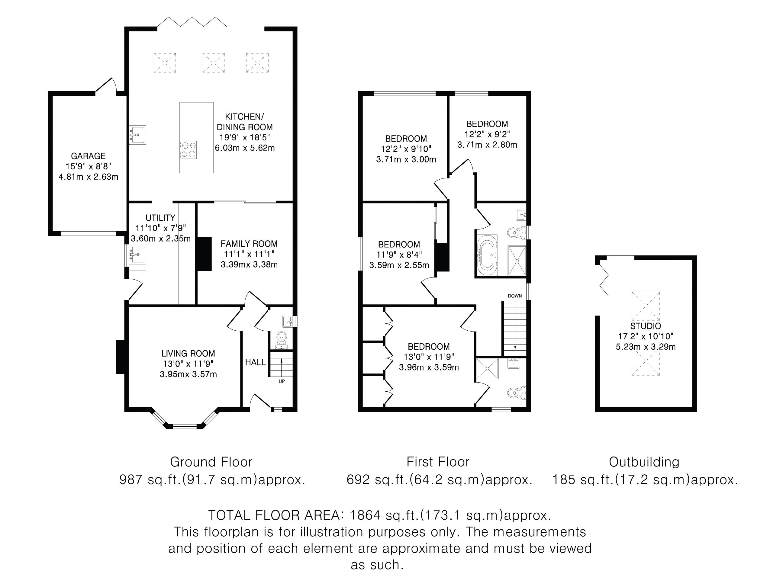 The ground floor features a welcoming entrance hall, a cosy living room, and an open-plan kitchen/dining room with a central island, underfloor heating, and bi-fold doors opening onto the patio. Adjacent is a family room with Crittall sliding doors, a utility room, and a cloakroom.