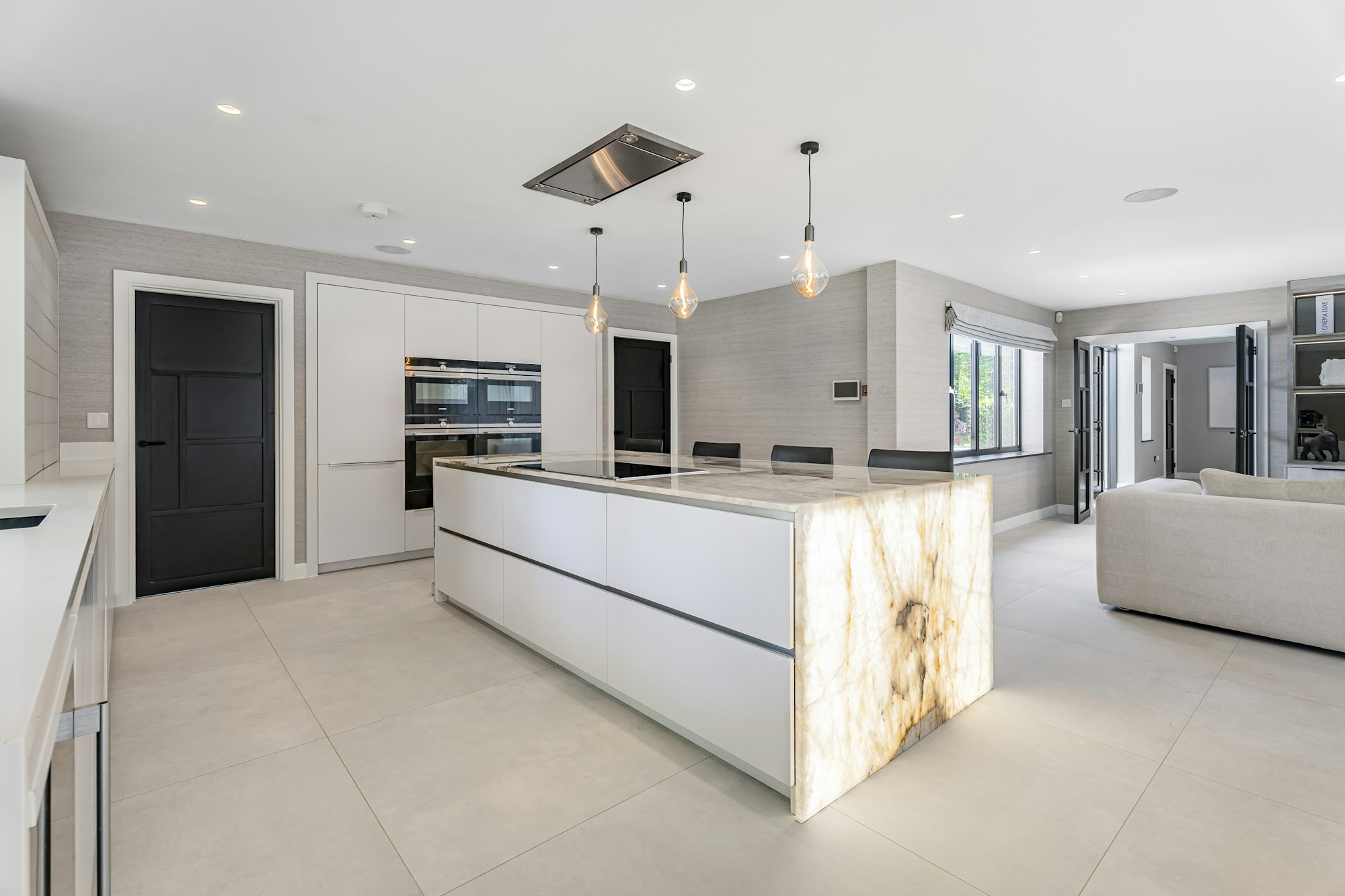 The heart of the home is undoubtedly the spectacular open-plan kitchen, living, and dining area - an exceptional space designed for both grand-scale entertaining and relaxed family living, all overlooking the stunning gardens and countryside beyond.