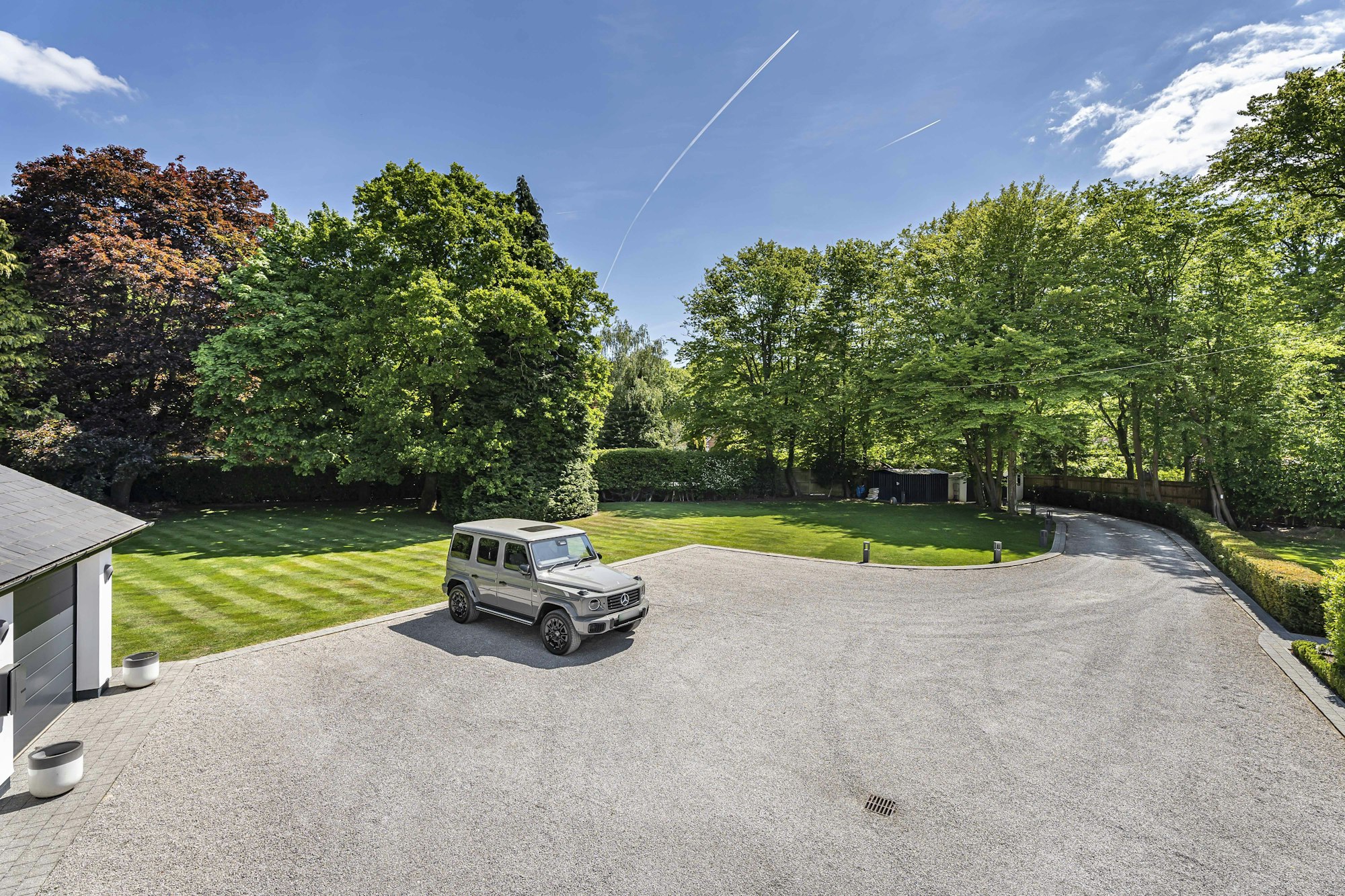 Occupying a prime, central position within its own meticulously landscaped one-acre plot, the property is approached via a secure, private and gated entrance and an impressive sweeping gravel driveway, providing ample parking for multiple vehicles alongside a detached double garage.