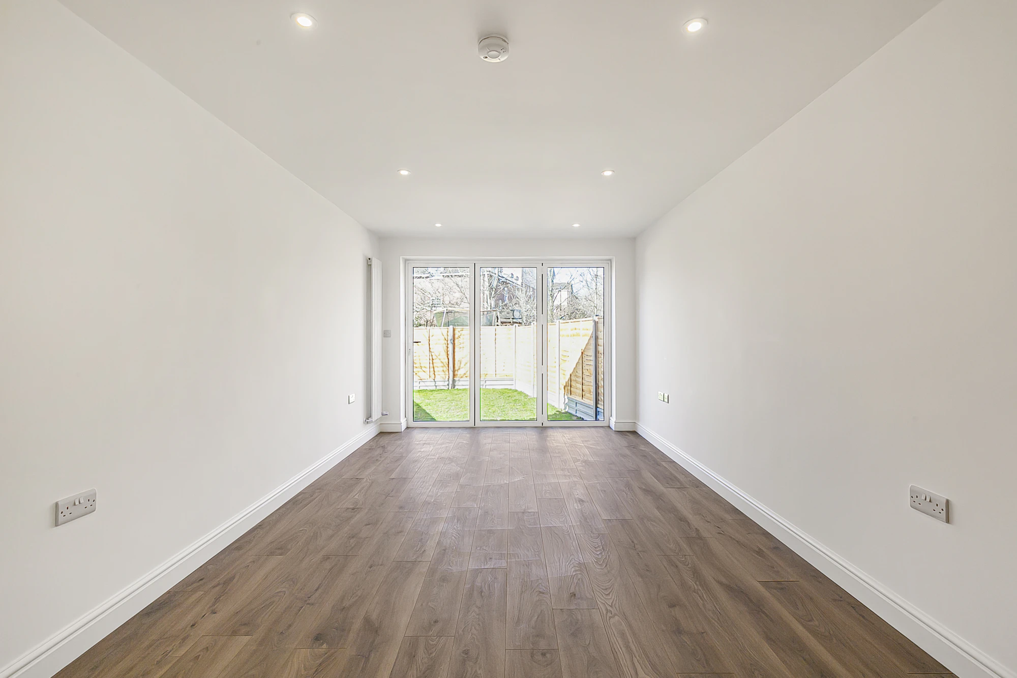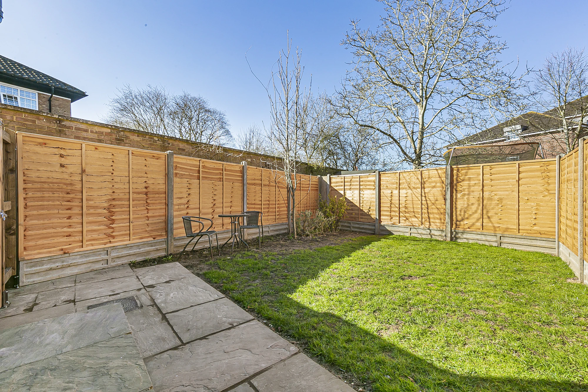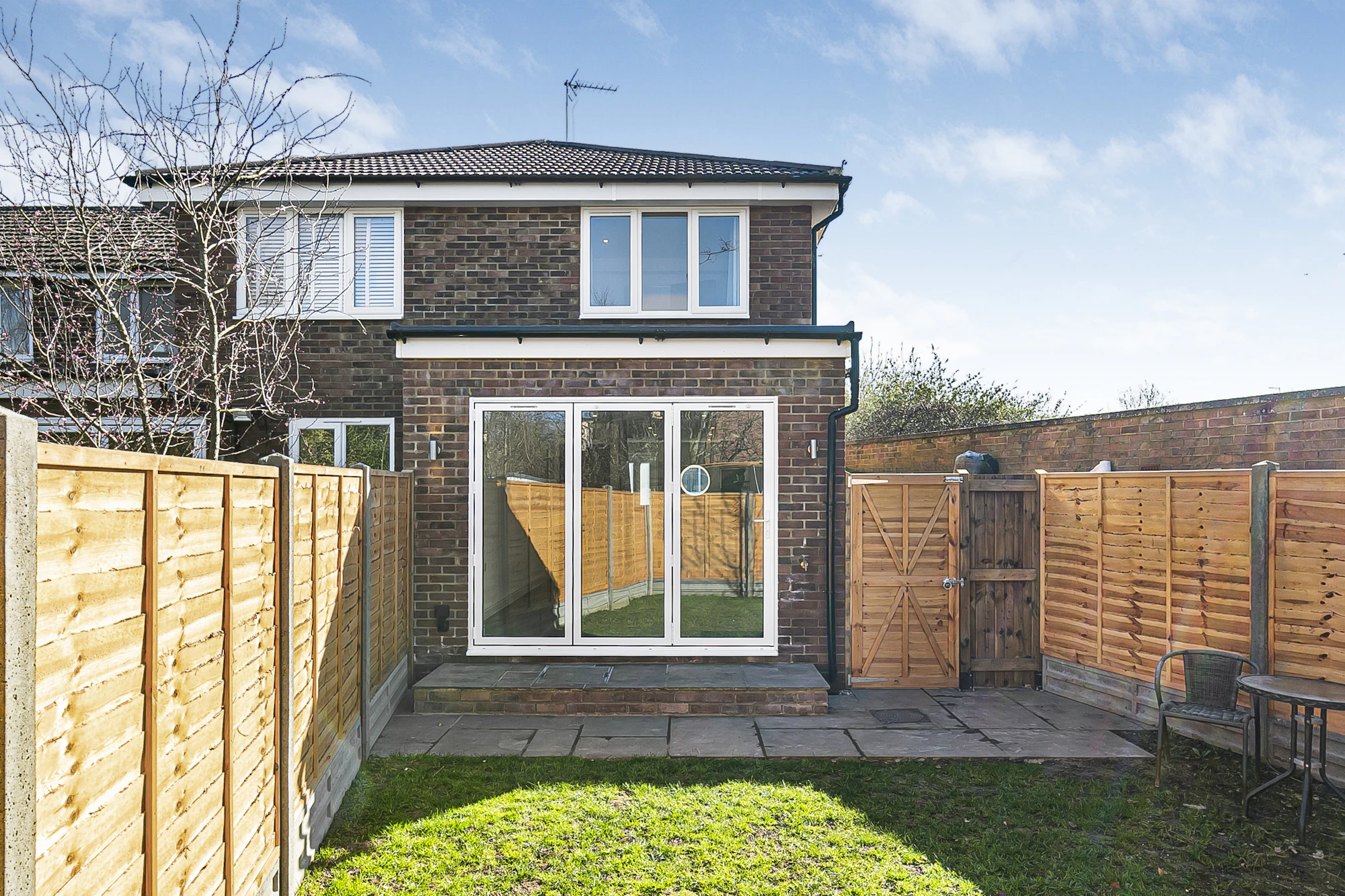 The rear garden is primarily laid to lawn, while the front offers driveway parking for one car.