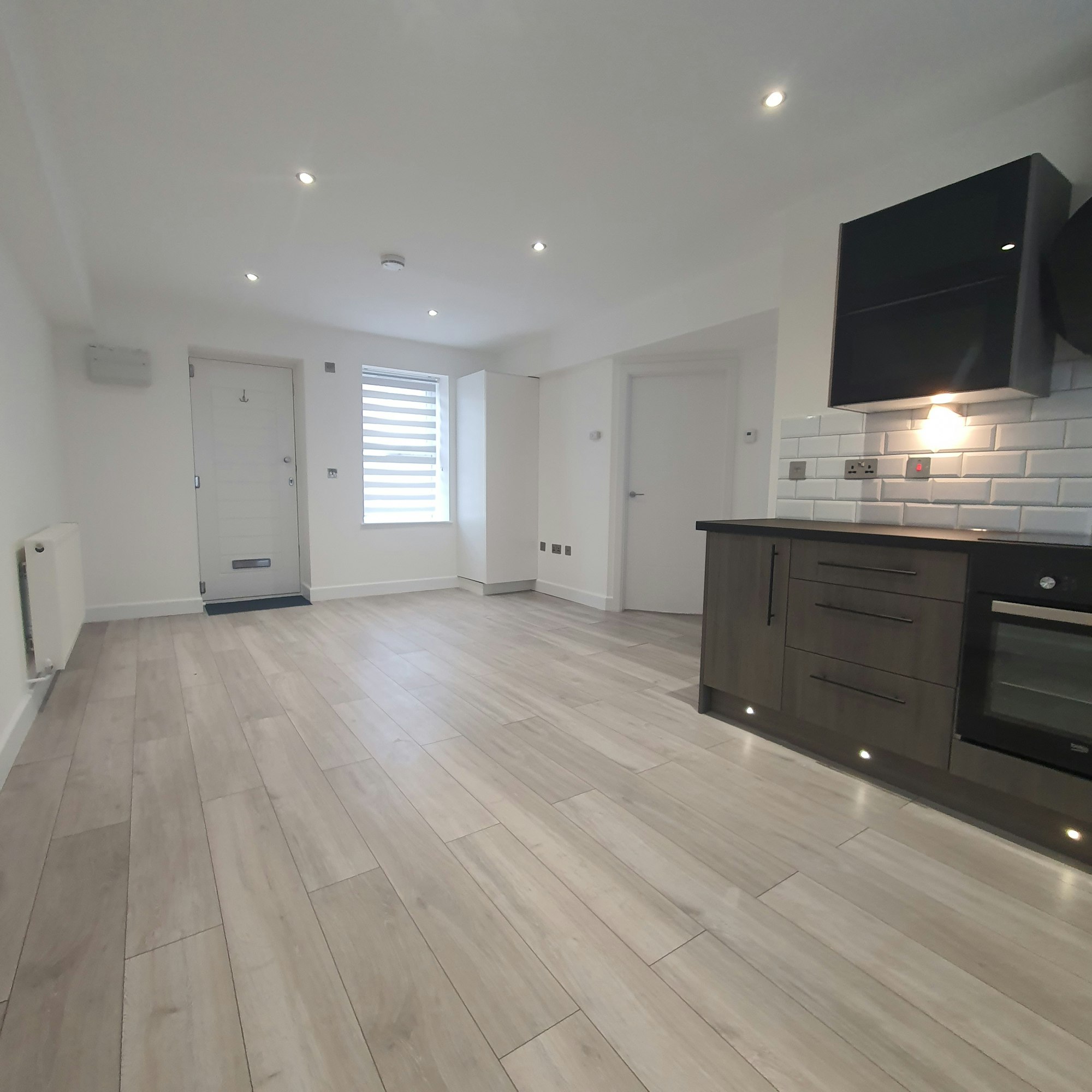 The property features a bright open-plan living and dining area, a modern fitted kitchen with integrated appliances, and two bedrooms. The bathroom is sleek and contemporary, finished to a high standard.